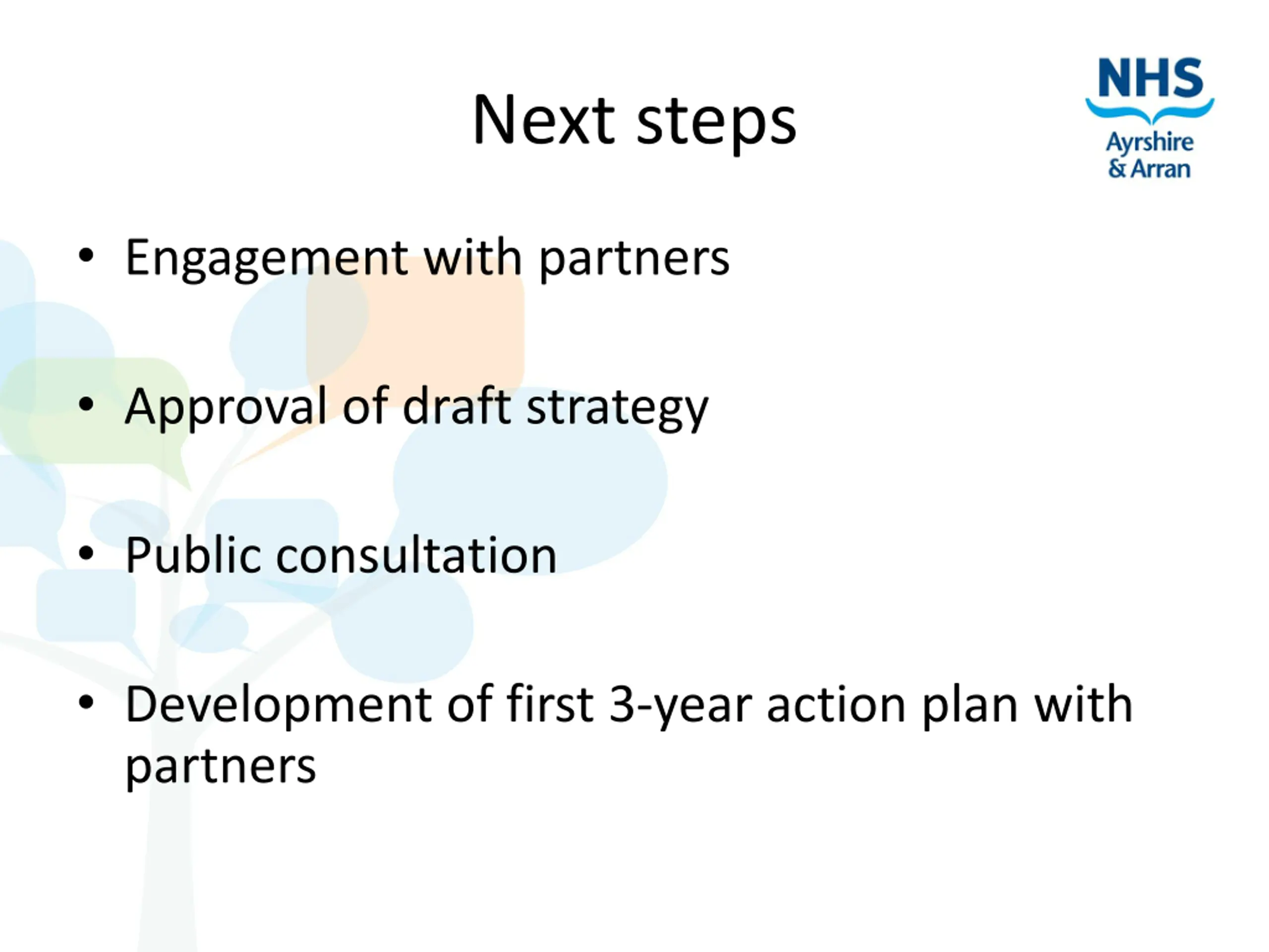 Next steps Engagement with partners Approval of draft strategy Public consultation Development of first 3-year action plan with partners