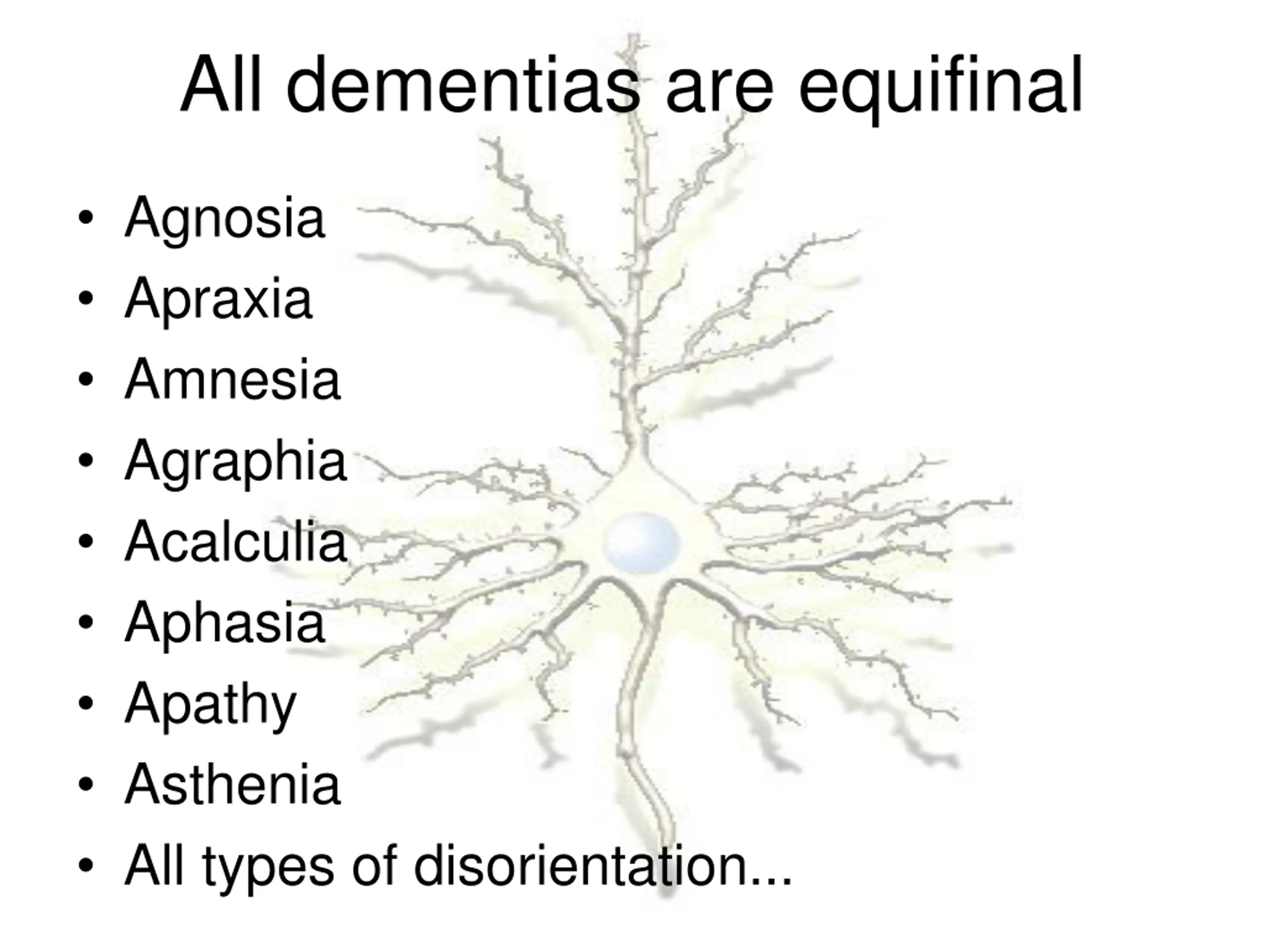 All dementias are equifinal Agnosia Apraxia Amnesia Agraphia Acalculia Aphasia Apathy Asthenia All types of disorientation...
