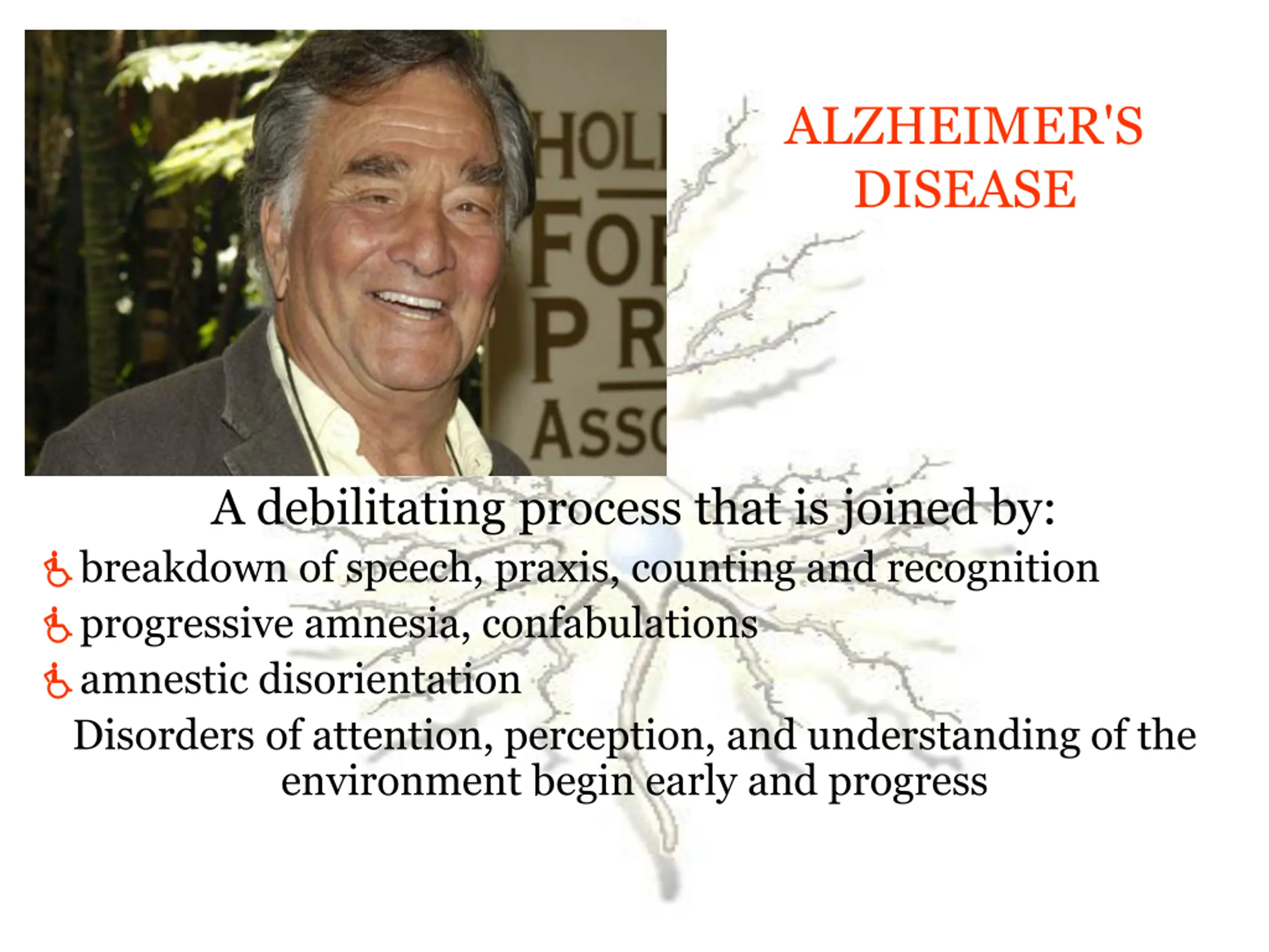 ALZHEIMER'S DISEASE A debilitating process that is joined by: breakdown of speech, praxis, counting and recognition progressive amnesia, confabulations amnestic disorientation Disorders of attention, perception, and understanding of the environment begin early and progress