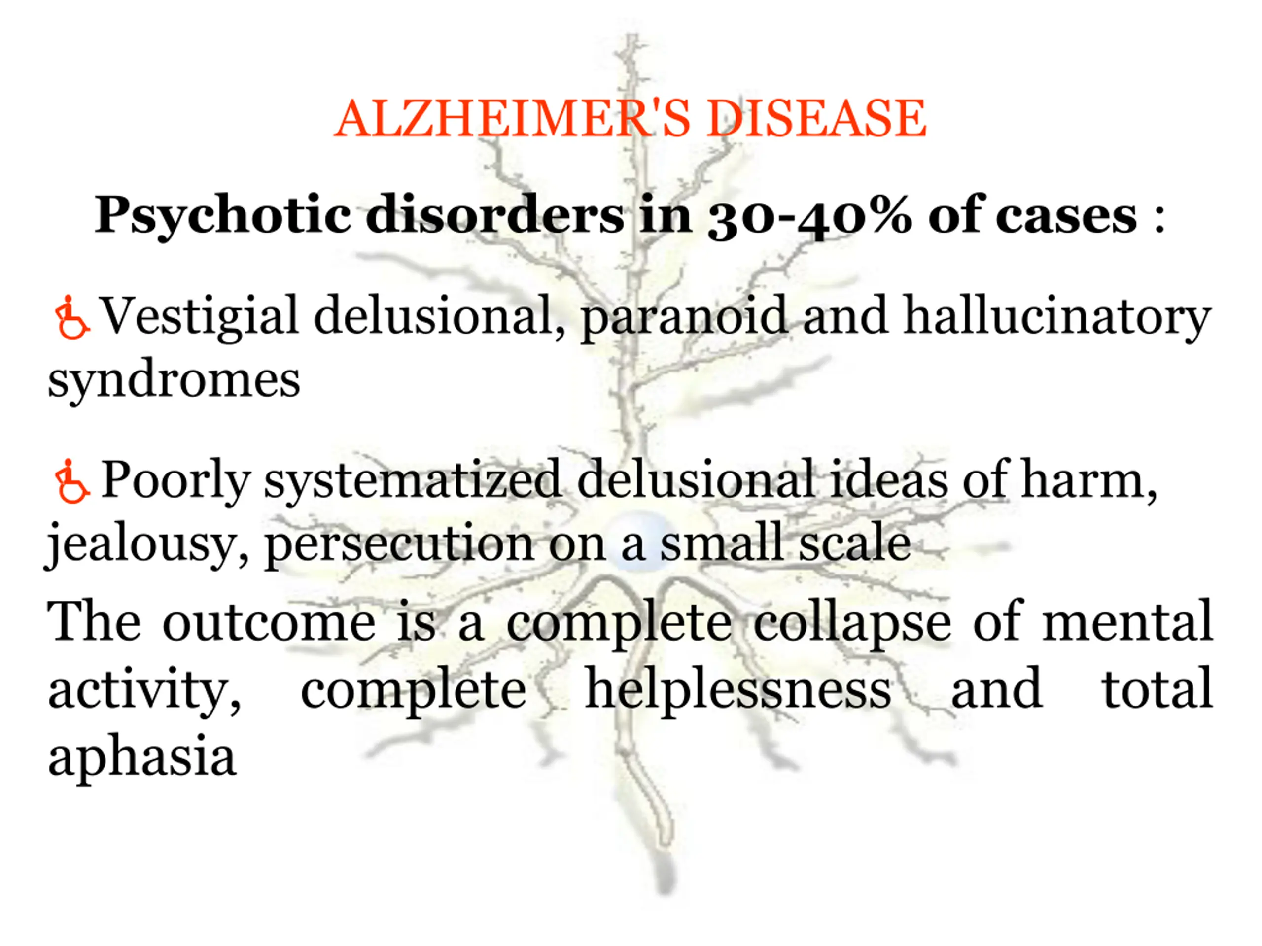 ALZHEIMER'S DISEASE Psychotic disorders in 30-40% of cases : Vestigial delusional, paranoid and hallucinatory syndromes Poorly systematized delusional ideas of harm, jealousy, persecution on a small scale The outcome is a complete collapse of mental activity, complete helplessness and total aphasia