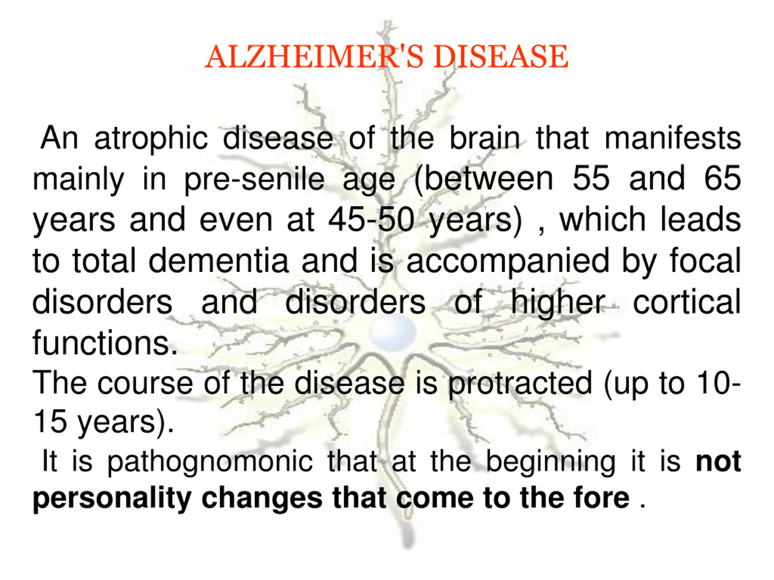 ALZHEIMER'S DISEASE An atrophic disease of the brain that manifests mainly in pre-senile age (between 55 and 65 years and even at 45-50 years) , which leads to total dementia and is accompanied by focal disorders and disorders of higher cortical functions. The course of the disease is protracted (up to 10- 15 years). It is pathognomonic that at the beginning it is not personality changes that come to the fore .