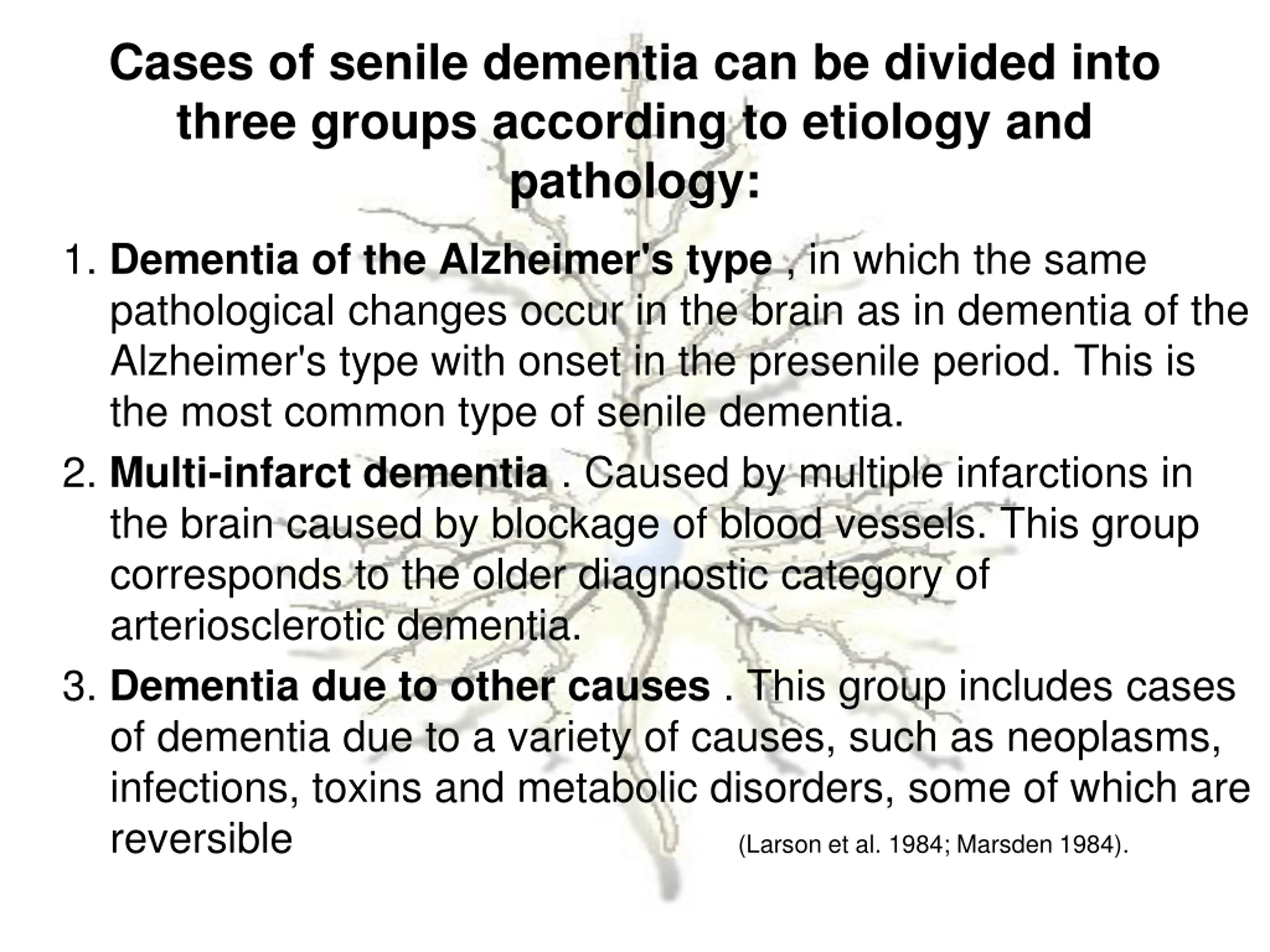 Cases of senile dementia can be divided into three groups according to etiology and pathology: 1. Dementia of the Alzheimer's type , in which the same pathological changes occur in the brain as in dementia of the Alzheimer's type with onset in the presenile period. This is the most common type of senile dementia. 2. Multi-infarct dementia . Caused by multiple infarctions in the brain caused by blockage of blood vessels. This group corresponds to the older diagnostic category of arteriosclerotic dementia. 3. Dementia due to other causes . This group includes cases of dementia due to a variety of causes, such as neoplasms, infections, toxins and metabolic disorders, some of which are reversible (Larson et al. 1984; Marsden 1984).
