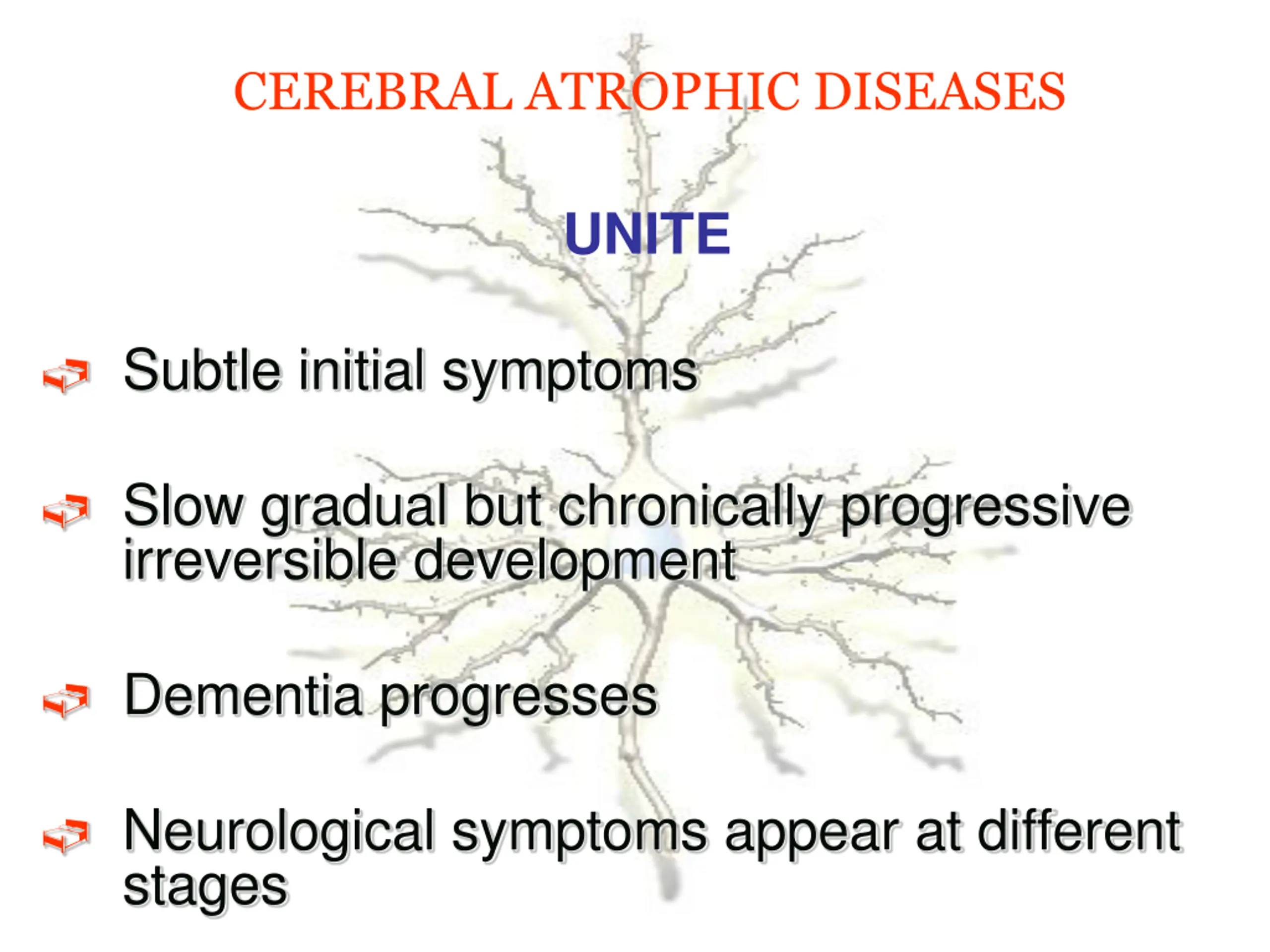 CEREBRAL ATROPHIC DISEASES UNITE Subtle initial symptoms Slow gradual but chronically progressive irreversible development Dementia progresses Neurological symptoms appear at different stages