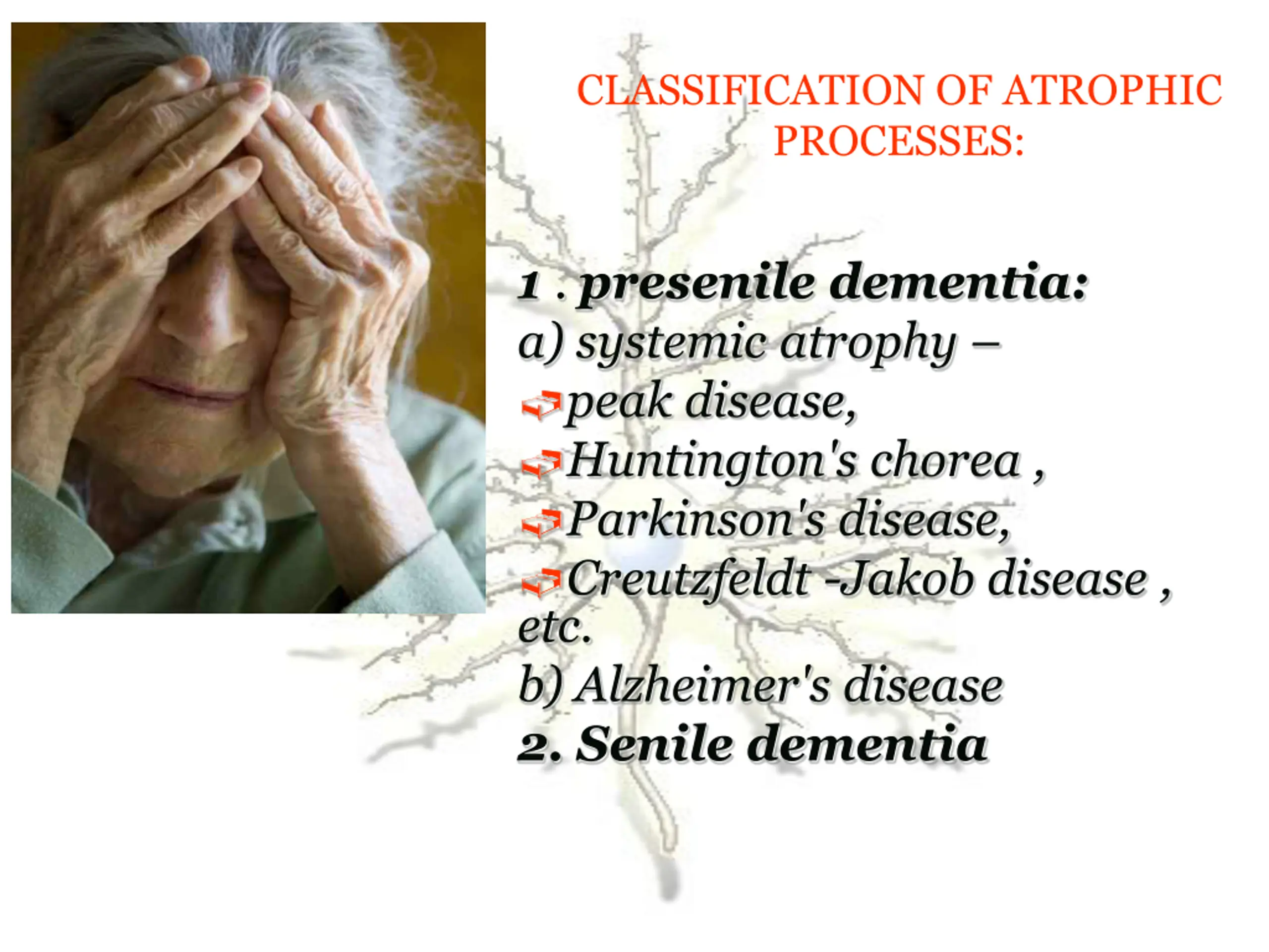 CLASSIFICATION OF ATROPHIC PROCESSES: 1 . presenile dementia: a) systemic atrophy peak disease, Huntington's chorea , Parkinson's disease, Creutzfeldt -Jakob disease , etc. b) Alzheimer's disease 2. Senile dementia