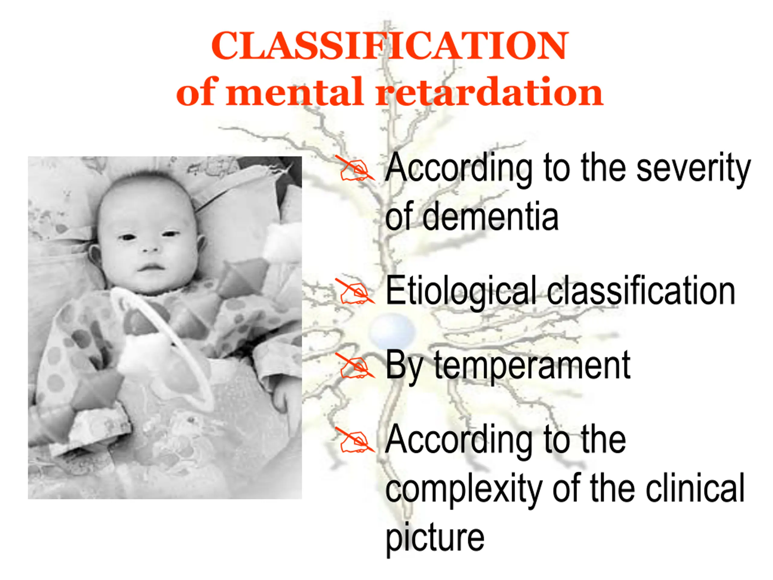 CLASSIFICATION of mental retardation According to the severity of dementia Etiological classification By temperament According to the complexity of the clinical picture