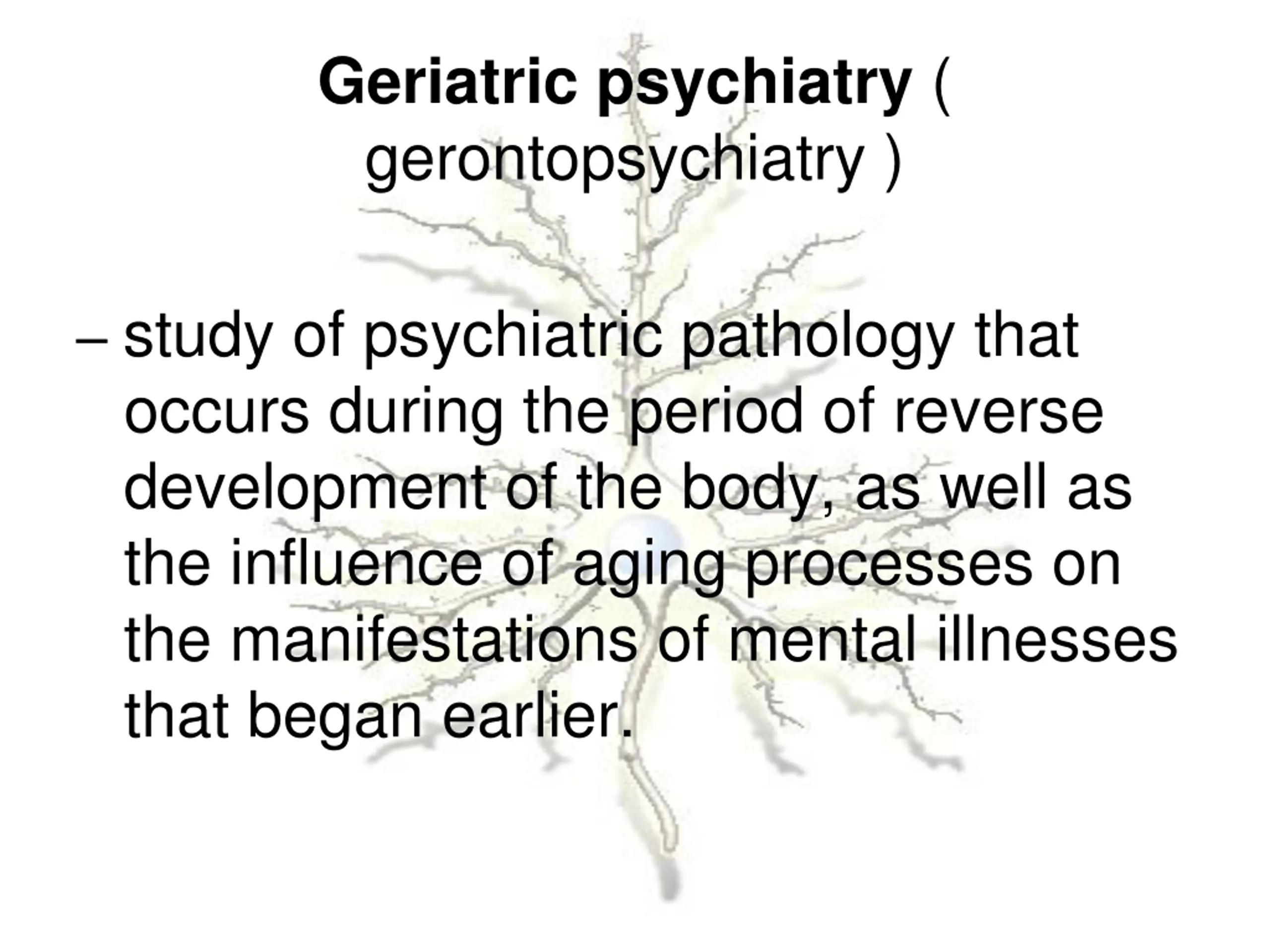 Geriatric psychiatry ( gerontopsychiatry ) study of psychiatric pathology that occurs during the period of reverse development of the body, as well as the influence of aging processes on the manifestations of mental illnesses that began earlier.