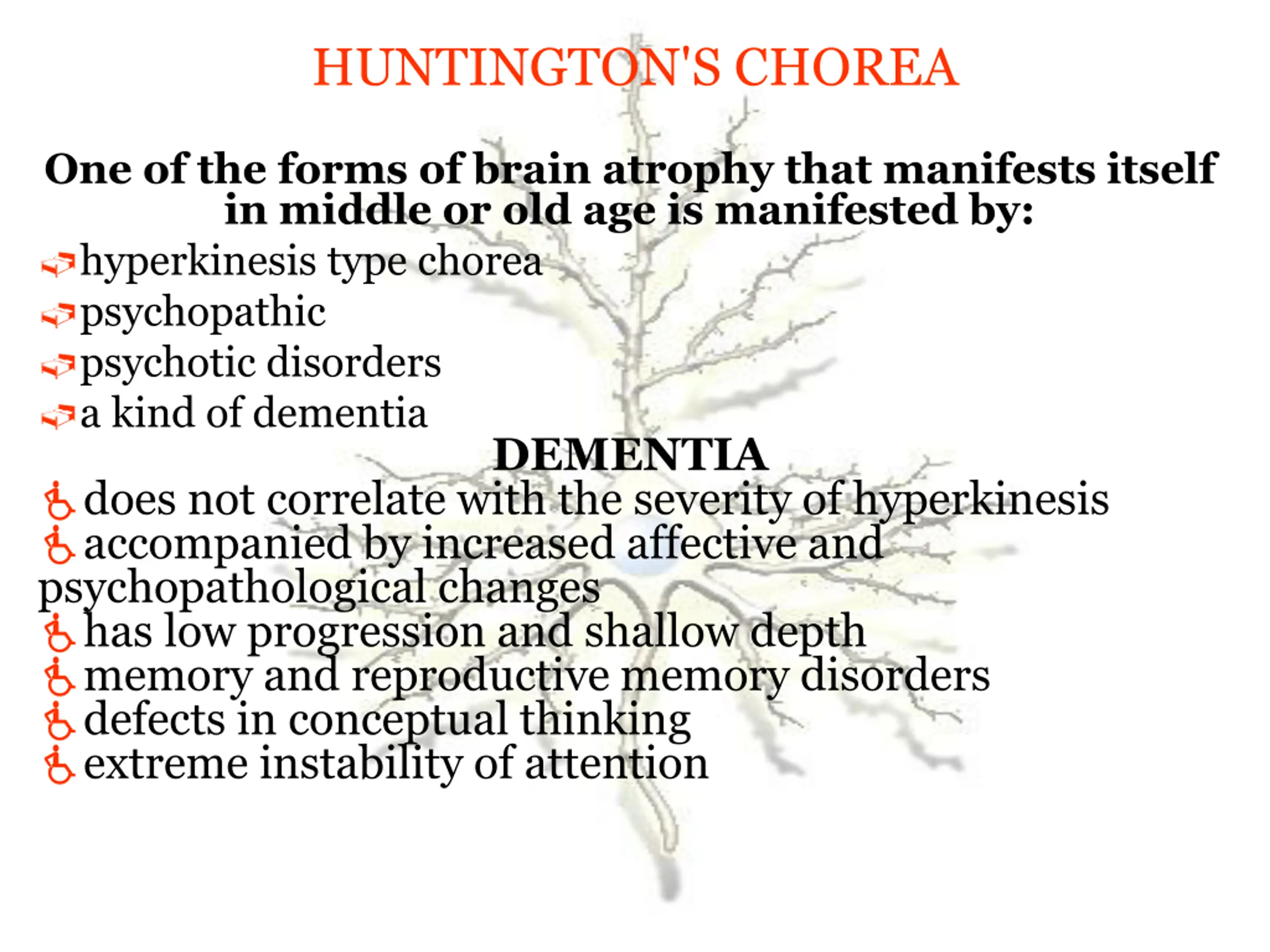 HUNTINGTON'S CHOREA One of the forms of brain atrophy that manifests itself in middle or old age is manifested by: hyperkinesis type chorea psychopathic psychotic disorders a kind of dementia DEMENTIA does not correlate with the severity of hyperkinesis accompanied by increased affective and psychopathological changes has low progression and shallow depth memory and reproductive memory disorders defects in conceptual thinking extreme instability of attention