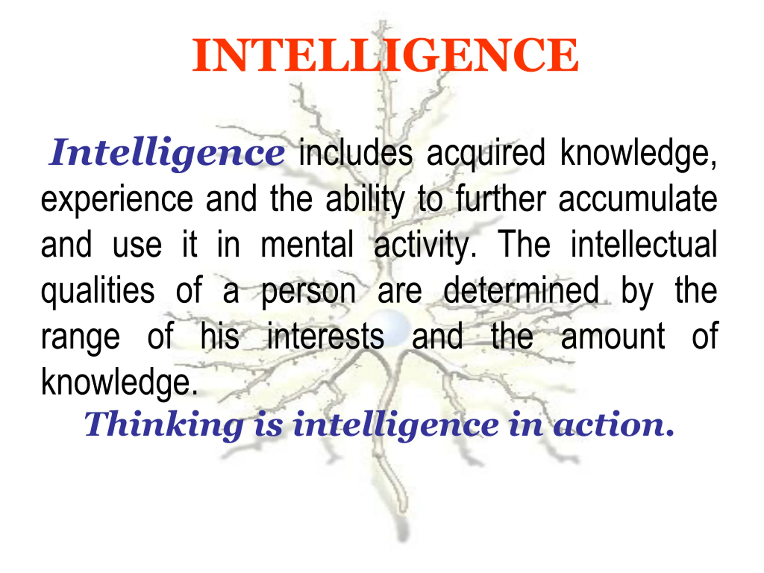 INTELLIGENCE Intelligence includes acquired knowledge, experience and the ability to further accumulate and use it in mental activity. The intellectual qualities of a person are determined by the range of his interests and the amount of knowledge. Thinking is intelligence in action.