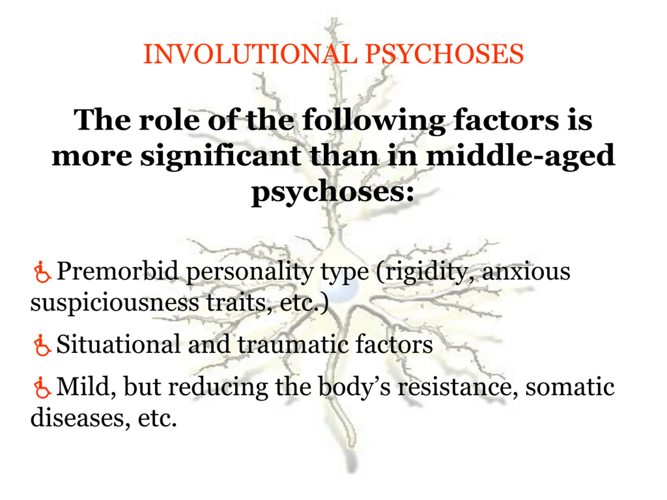 INVOLUTIONAL PSYCHOSES The role of the following factors is more significant than in middle-aged psychoses: Premorbid personality type (rigidity, anxious suspiciousness traits, etc.) Situational and traumatic factors Mild, but reducing the body s resistance, somatic diseases, etc.