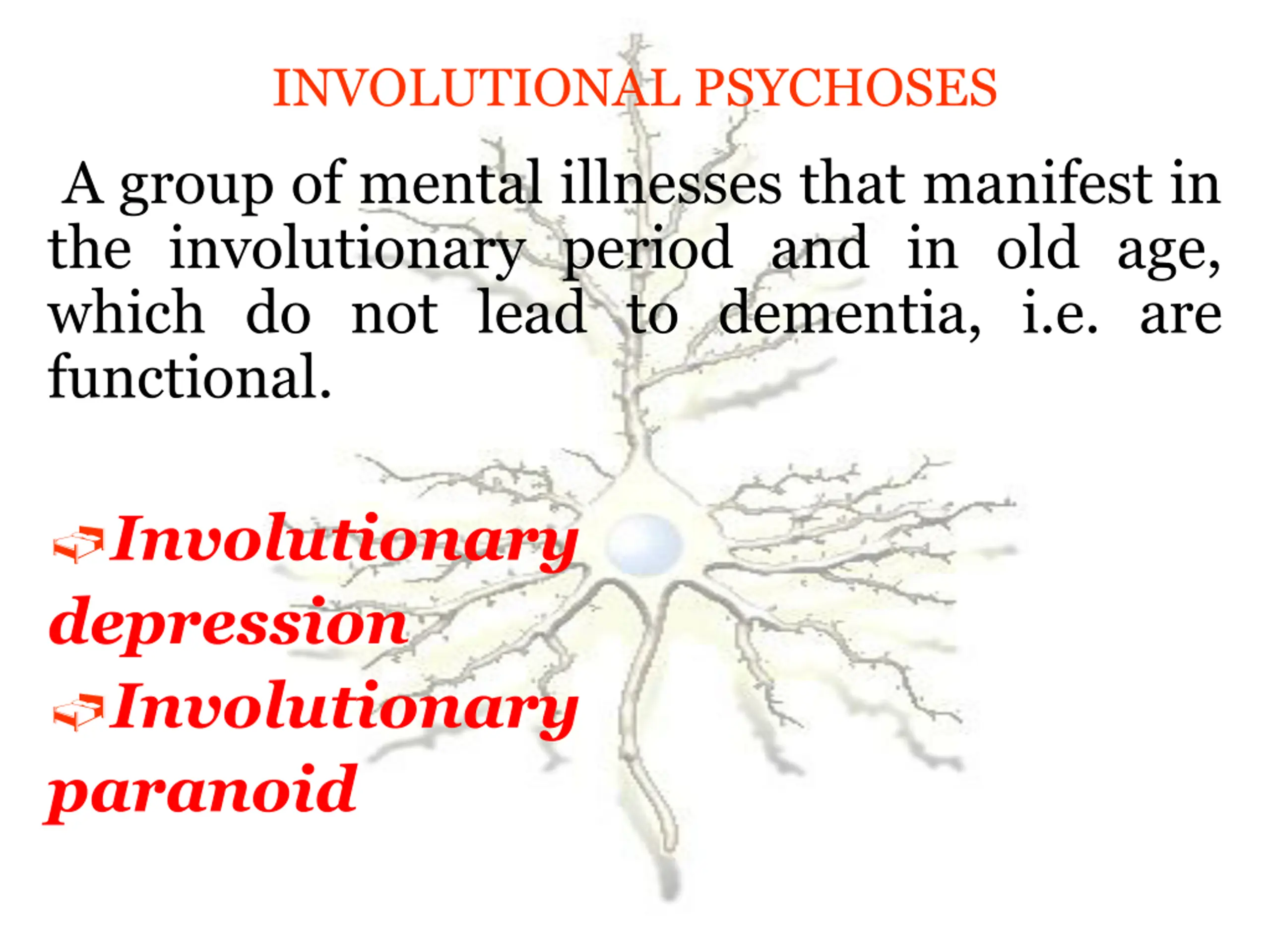 INVOLUTIONAL PSYCHOSES A group of mental illnesses that manifest in the involutionary period and in old age, which do not lead to dementia, i.e. are functional. Involutionary depression Involutionary paranoid