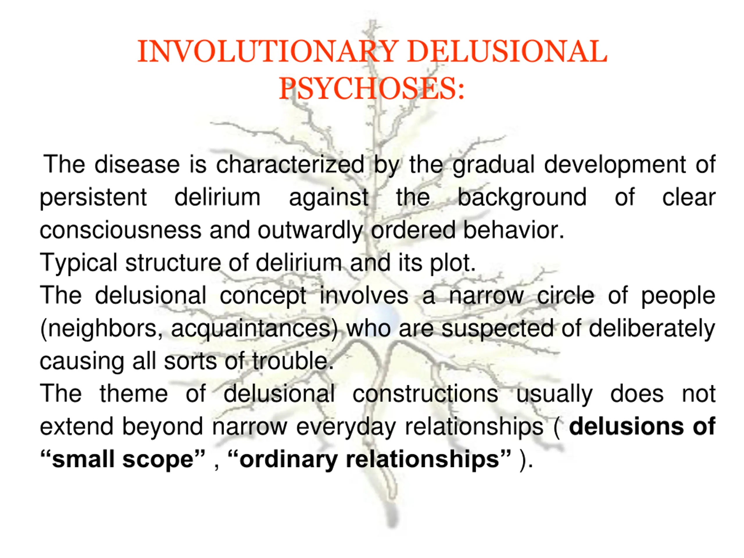 INVOLUTIONARY DELUSIONAL PSYCHOSES: The disease is characterized by the gradual development of persistent delirium against the background of clear consciousness and outwardly ordered behavior. Typical structure of delirium and its plot. The delusional concept involves a narrow circle of people (neighbors, acquaintances) who are suspected of deliberately causing all sorts of trouble. The theme of delusional constructions usually does not extend beyond narrow everyday relationships ( delusions of smallscope , ordinaryrelationships ).