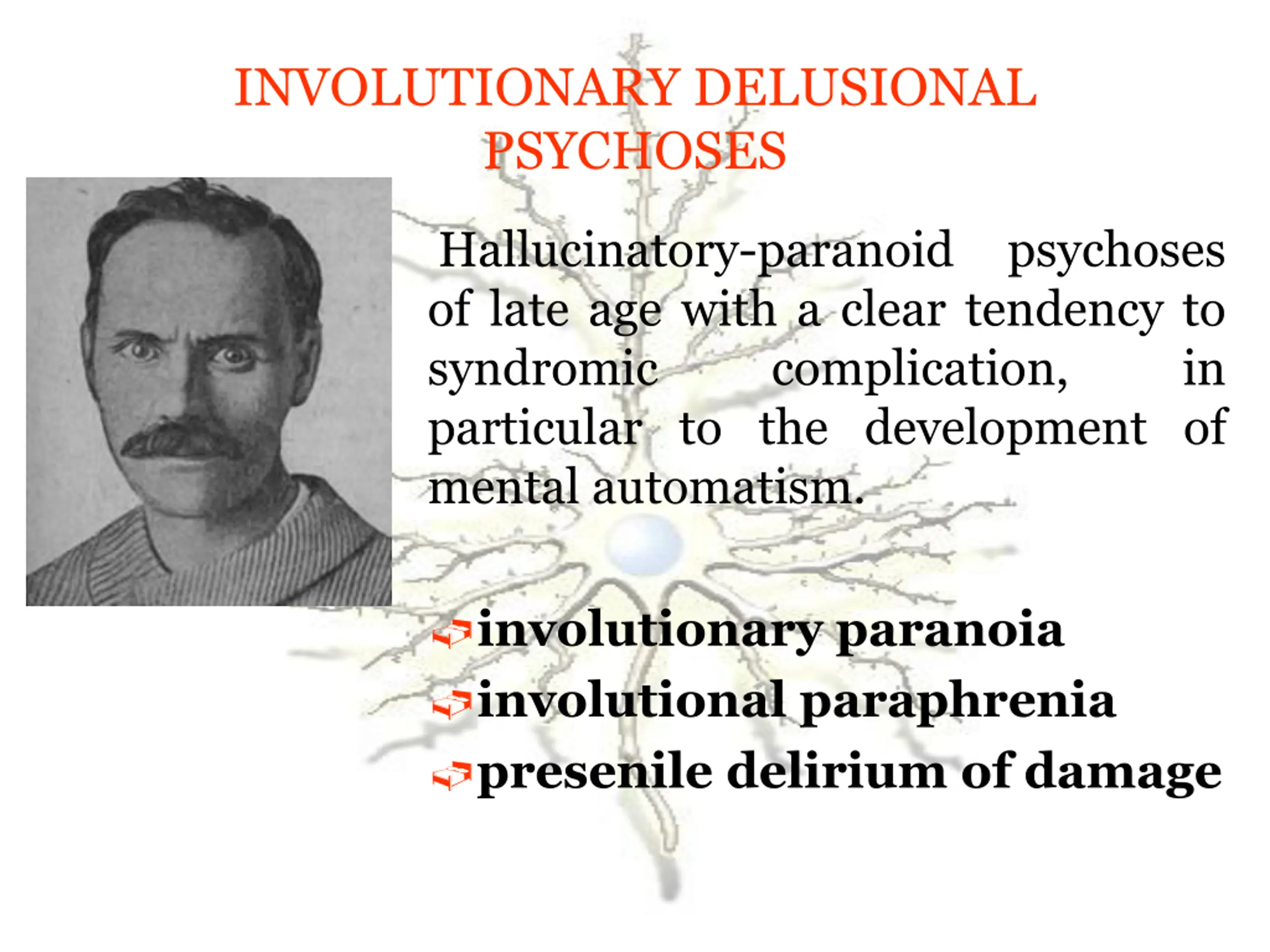 INVOLUTIONARY DELUSIONAL PSYCHOSES Hallucinatory-paranoid psychoses of late age with a clear tendency to syndromic complication, particular to the development of mental automatism. in involutionary paranoia involutional paraphrenia presenile delirium of damage