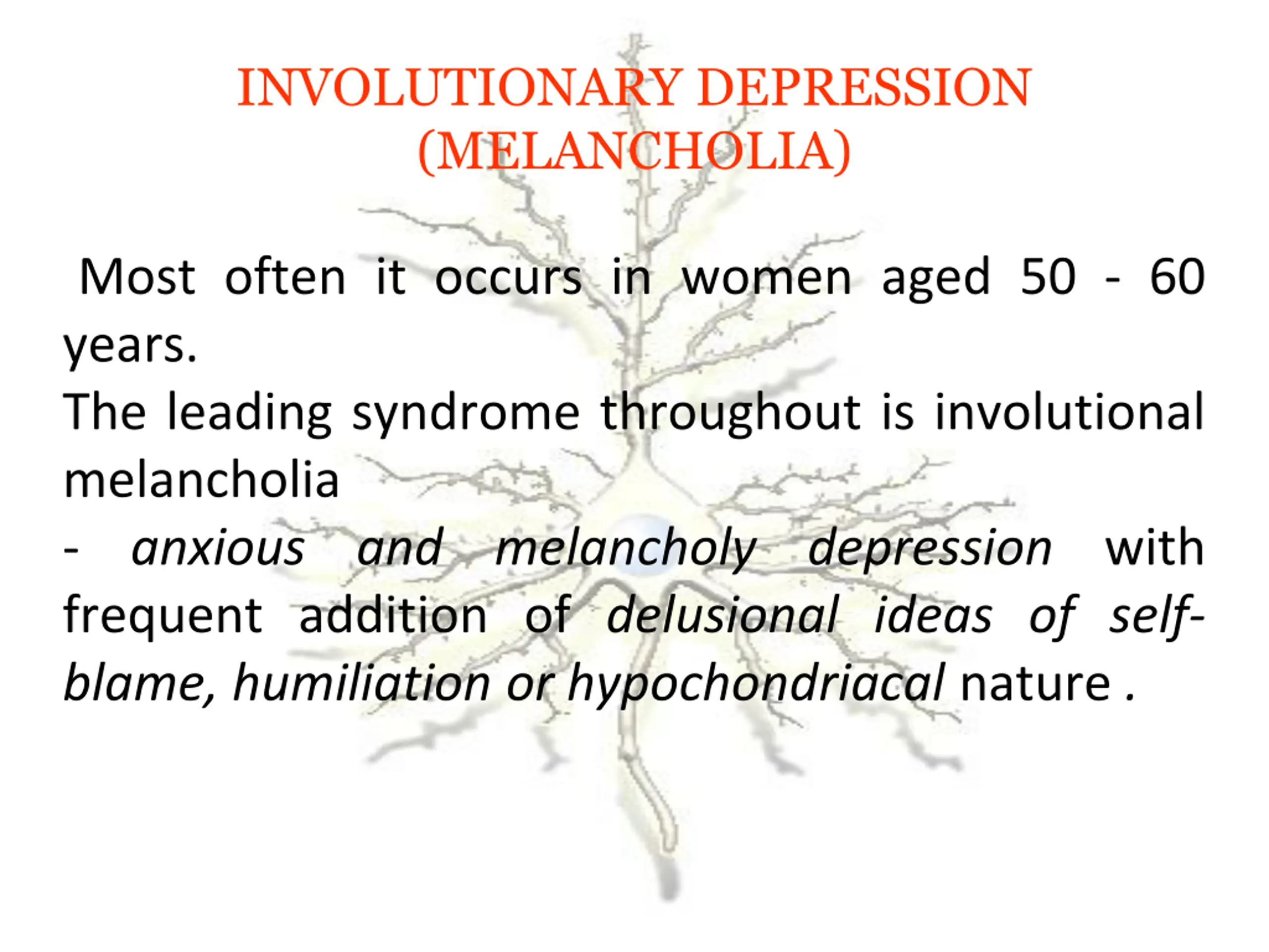 INVOLUTIONARY DEPRESSION (MELANCHOLIA) Most often it occurs in women aged 50 - 60 years. The leading syndrome throughout is involutional melancholia - anxious and melancholy depression with frequent addition of delusional ideas of self- blame, humiliation or hypochondriacal nature .