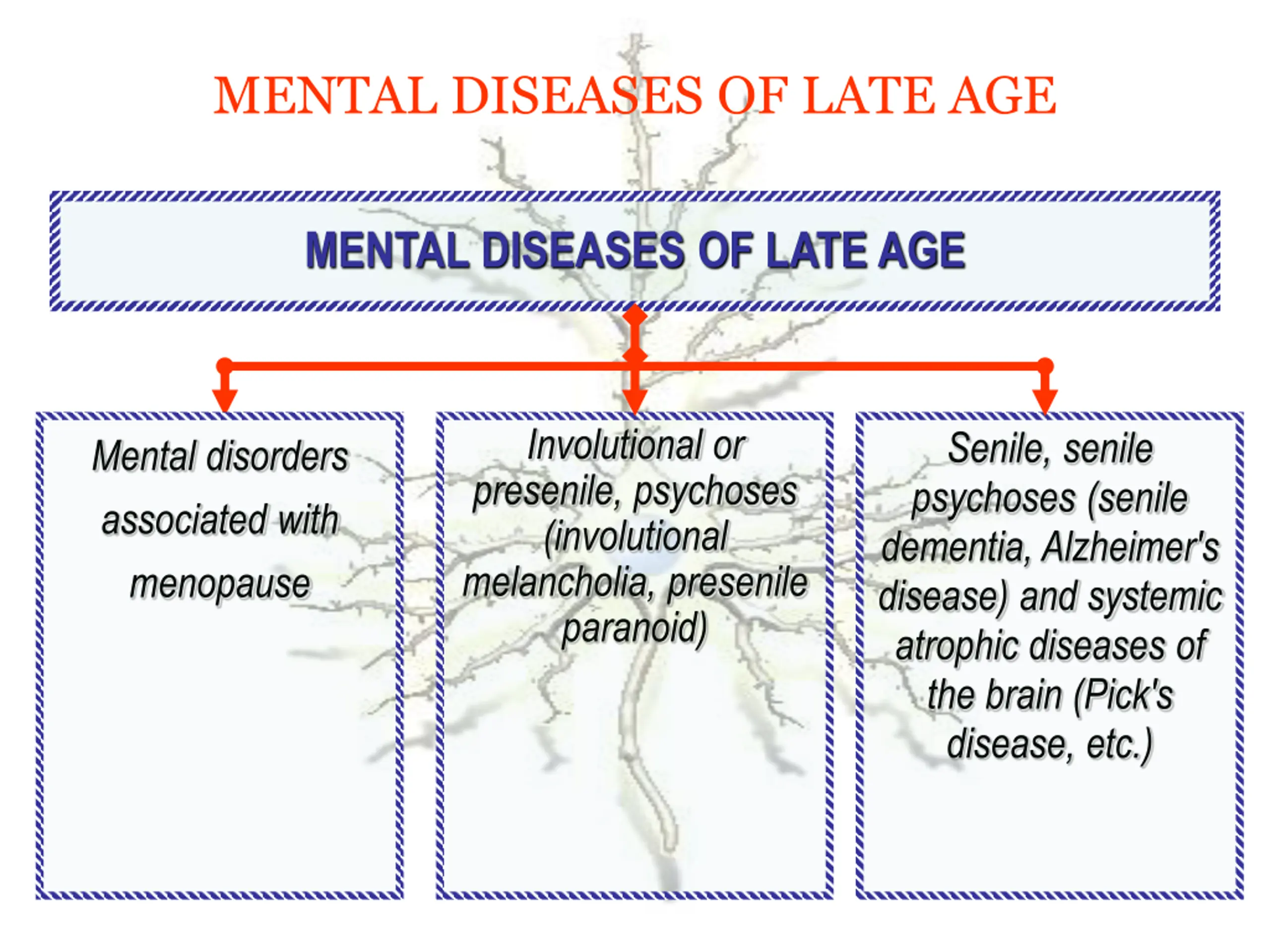 MENTAL DISEASES OF LATE AGE MENTAL DISEASES OF LATE AGE Involutional or presenile, psychoses (involutional melancholia, presenile paranoid) Senile, senile psychoses (senile dementia, Alzheimer's disease) and systemic atrophic diseases of the brain (Pick's disease, etc.) Mental disorders associated with menopause