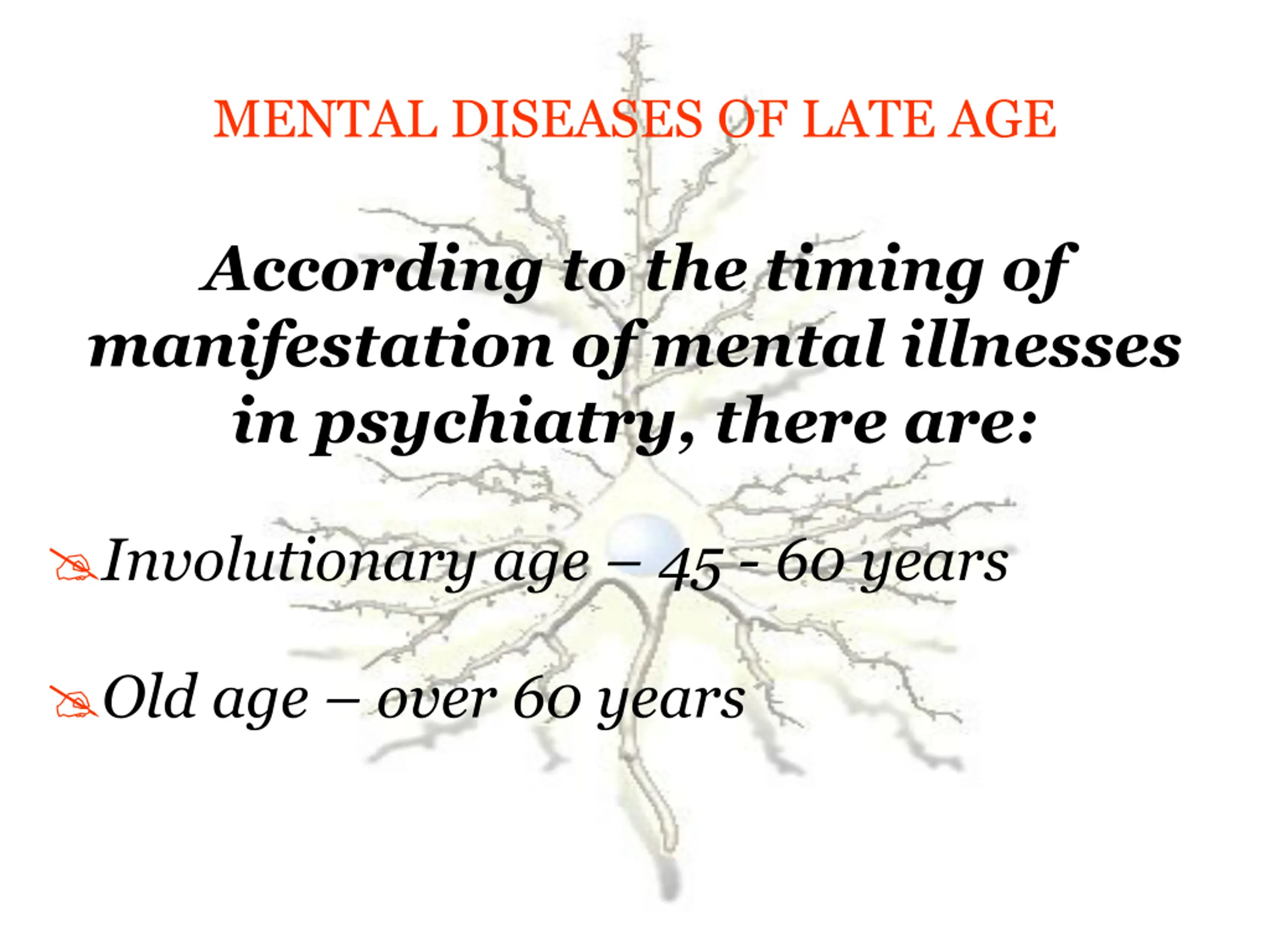 MENTAL DISEASES OF LATE AGE According to the timing of manifestation of mental illnesses in psychiatry, there are: Involutionary age 45 - 60 years Old age over 60 years
