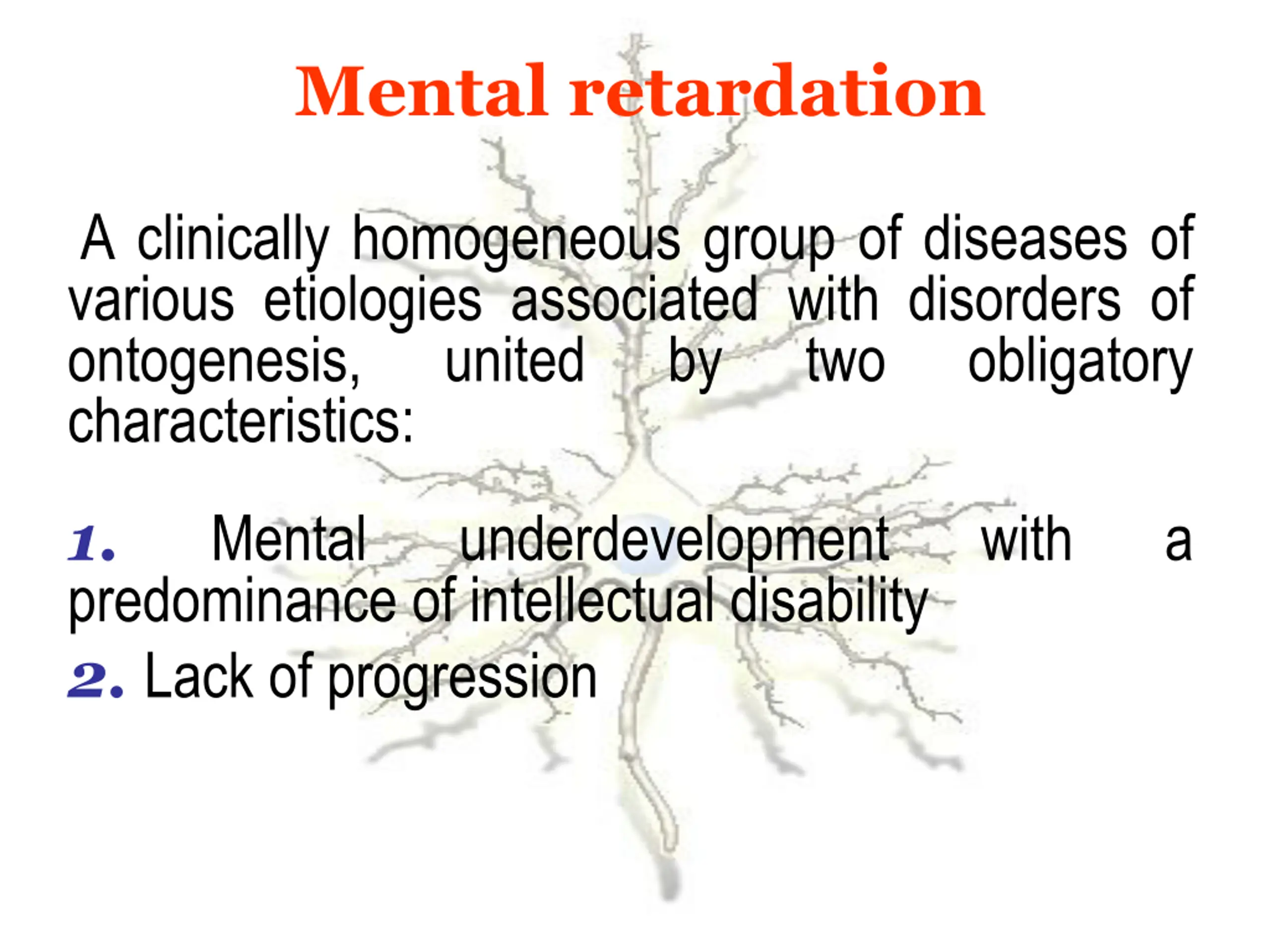 Mental retardation A clinically homogeneous group of diseases of various etiologies associated with disorders of ontogenesis, united characteristics: by two obligatory Mental underdevelopment with a 1. predominance of intellectual disability 2. Lack of progression