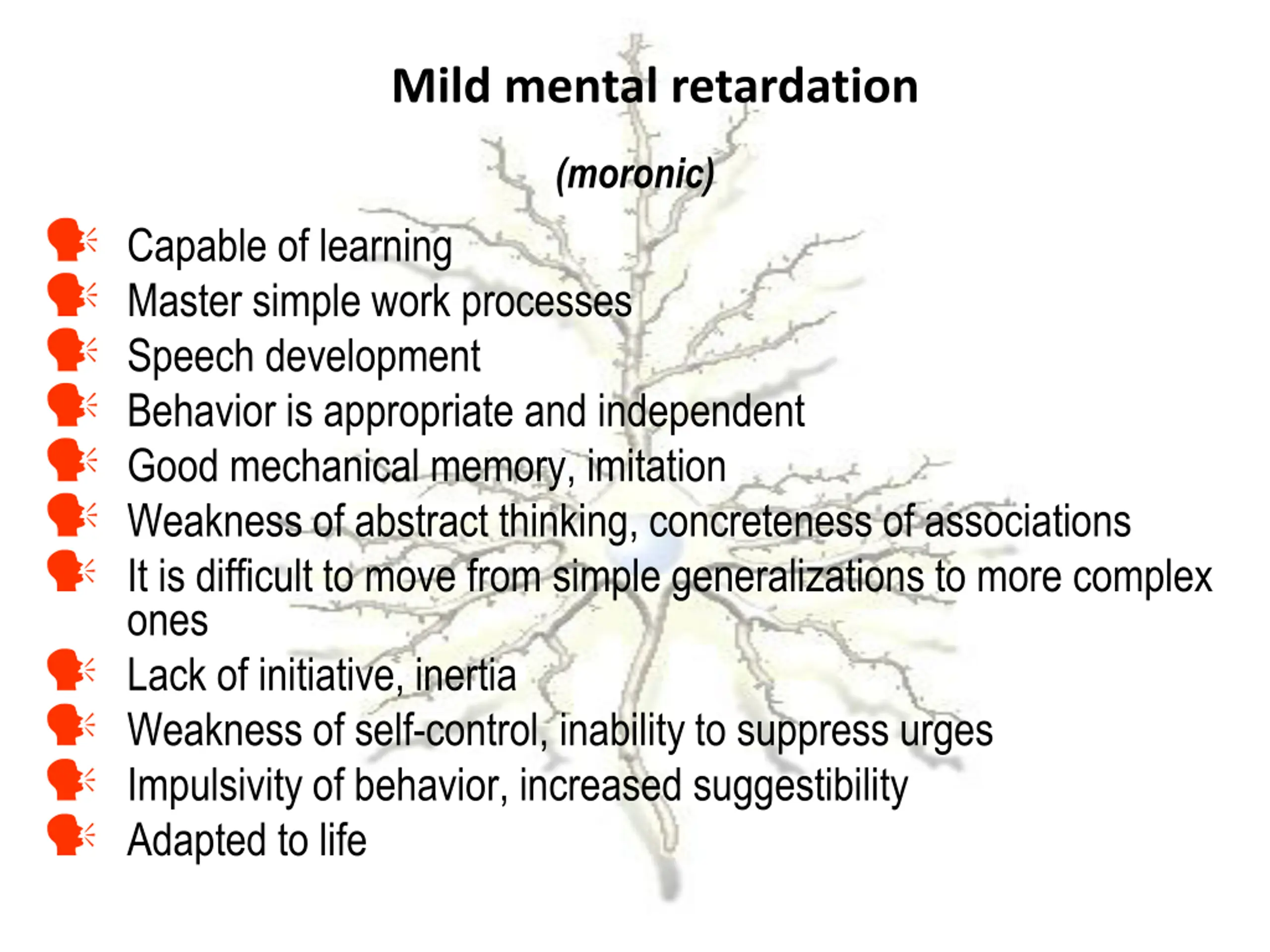 Mild mental retardation (moronic) Capable of learning Master simple work processes Speech development Behavior is appropriate and independent Good mechanical memory, imitation Weakness of abstract thinking, concreteness of associations It is difficult to move from simple generalizations to more complex ones Lack of initiative, inertia Weakness of self-control, inability to suppress urges Impulsivity of behavior, increased suggestibility Adapted to life