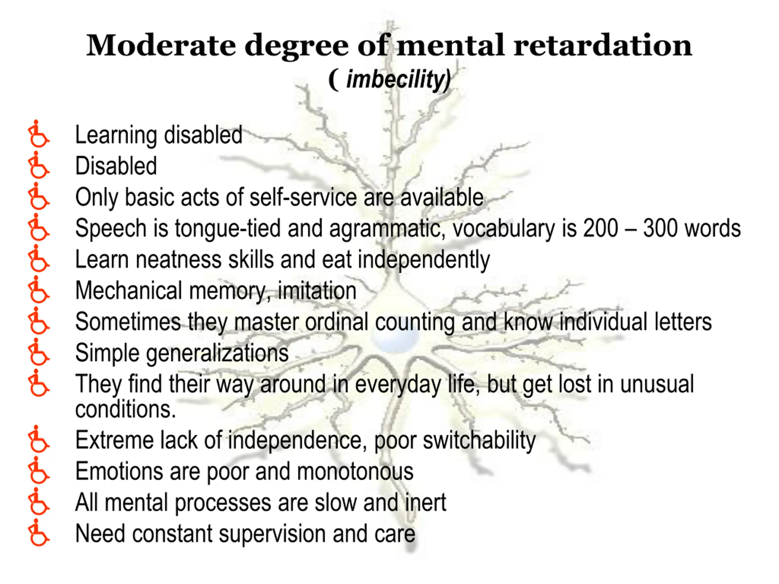 Moderate degree of mental retardation ( imbecility) Learning disabled Disabled Only basic acts of self-service are available Speech is tongue-tied and agrammatic, vocabulary is 200 300 words Learn neatness skills and eat independently Mechanical memory, imitation Sometimes they master ordinal counting and know individual letters Simple generalizations They find their way around in everyday life, but get lost in unusual conditions. Extreme lack of independence, poor switchability Emotions are poor and monotonous All mental processes are slow and inert Need constant supervision and care