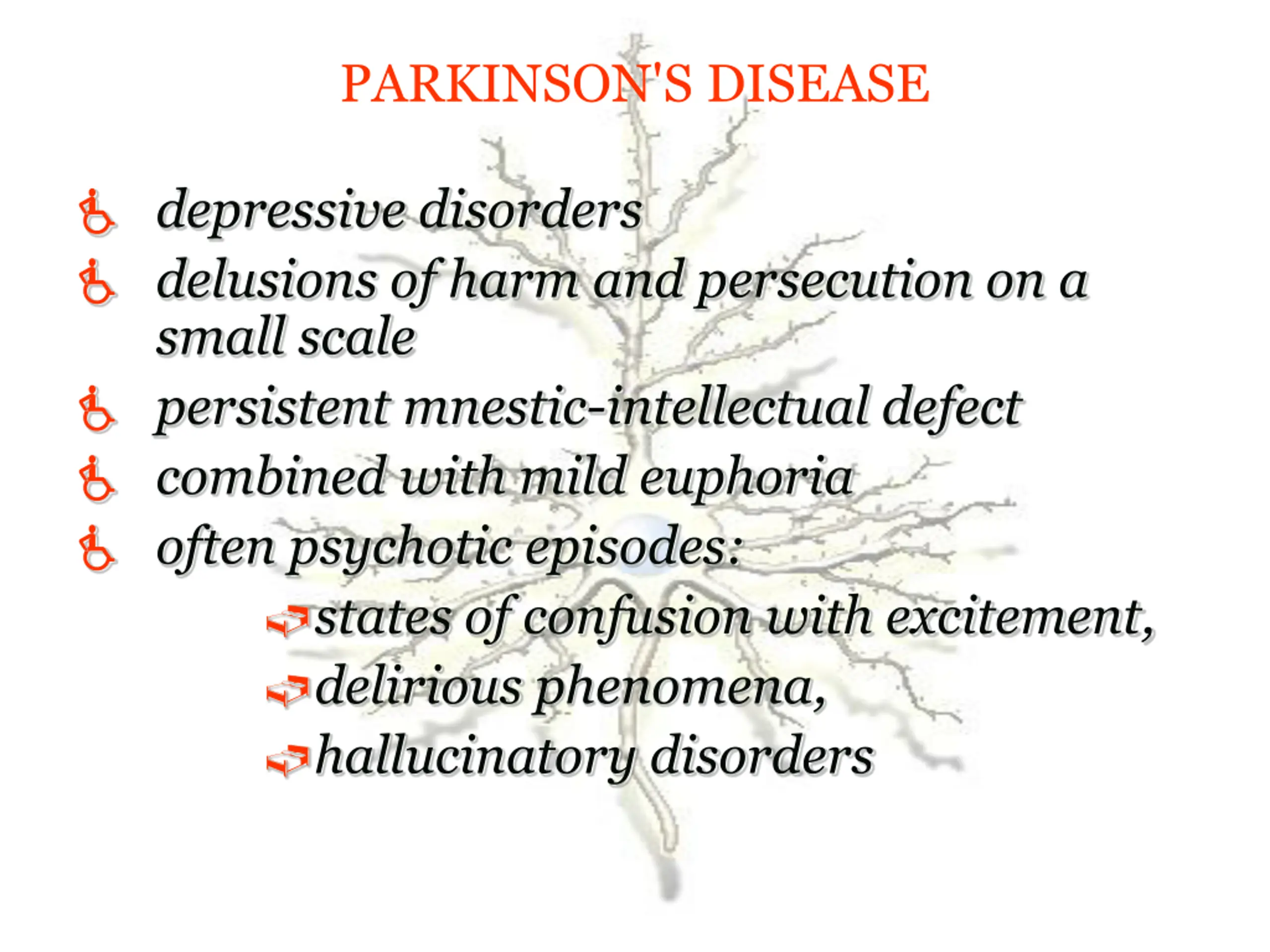 PARKINSON'S DISEASE depressive disorders delusions of harm and persecution on a small scale persistent mnestic-intellectual defect combined with mild euphoria often psychotic episodes: states of confusion with excitement, delirious phenomena, hallucinatory disorders