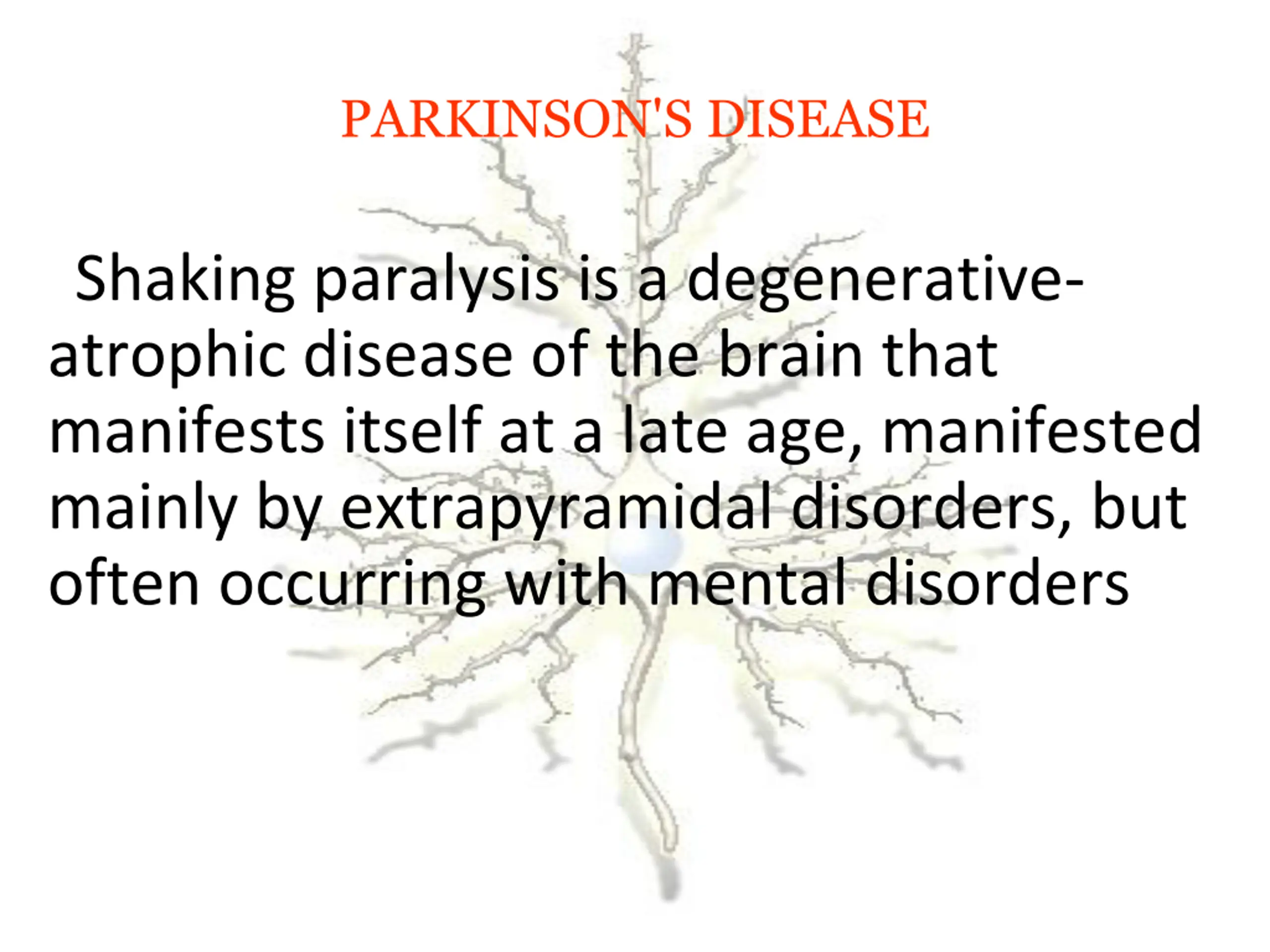 PARKINSON'S DISEASE Shaking paralysis is a degenerative- atrophic disease of the brain that manifests itself at a late age, manifested mainly by extrapyramidal disorders, but often occurring with mental disorders