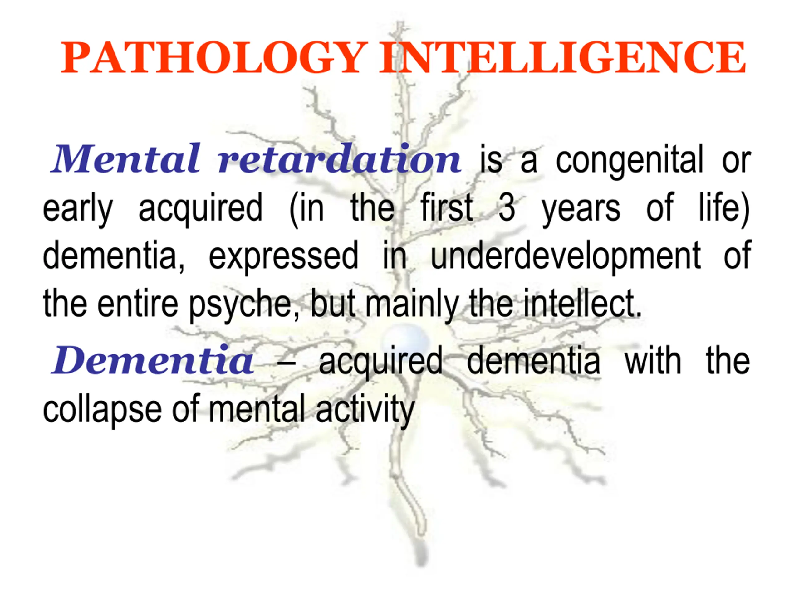 PATHOLOGY INTELLIGENCE Mental retardation is a congenital or early acquired (in the first 3 years of life) dementia, expressed in underdevelopment of the entire psyche, but mainly the intellect. Dementia acquired dementia with the collapse of mental activity