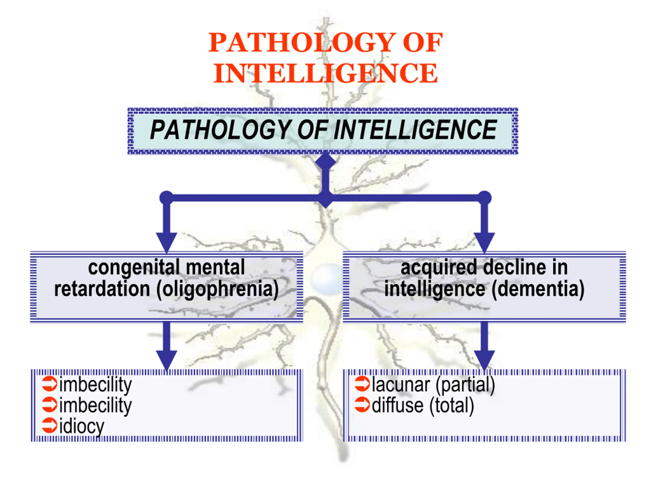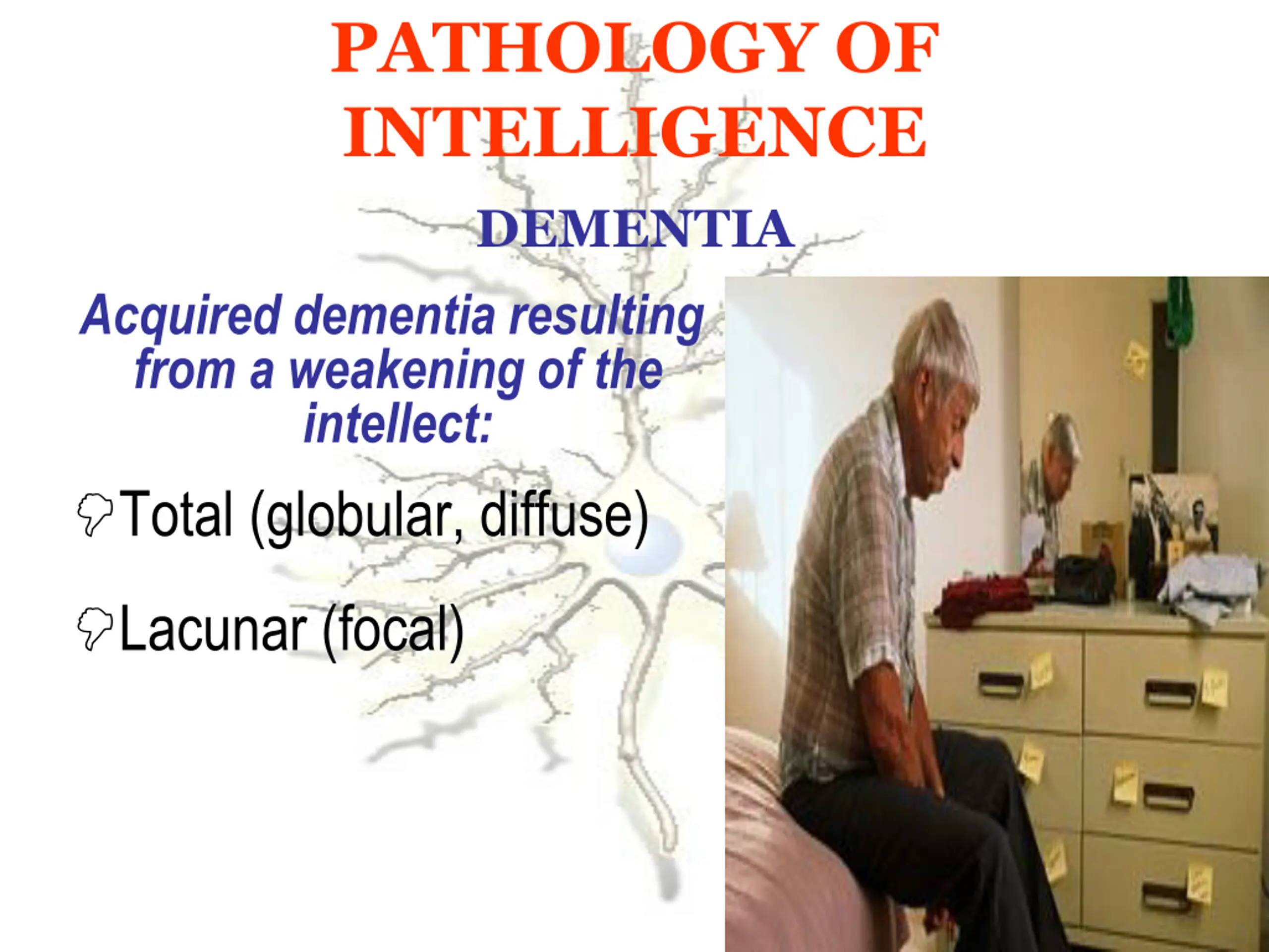 PATHOLOGY OF INTELLIGENCE DEMENTIA Acquired dementia resulting from a weakening of the intellect: Total (globular, diffuse) Lacunar (focal)