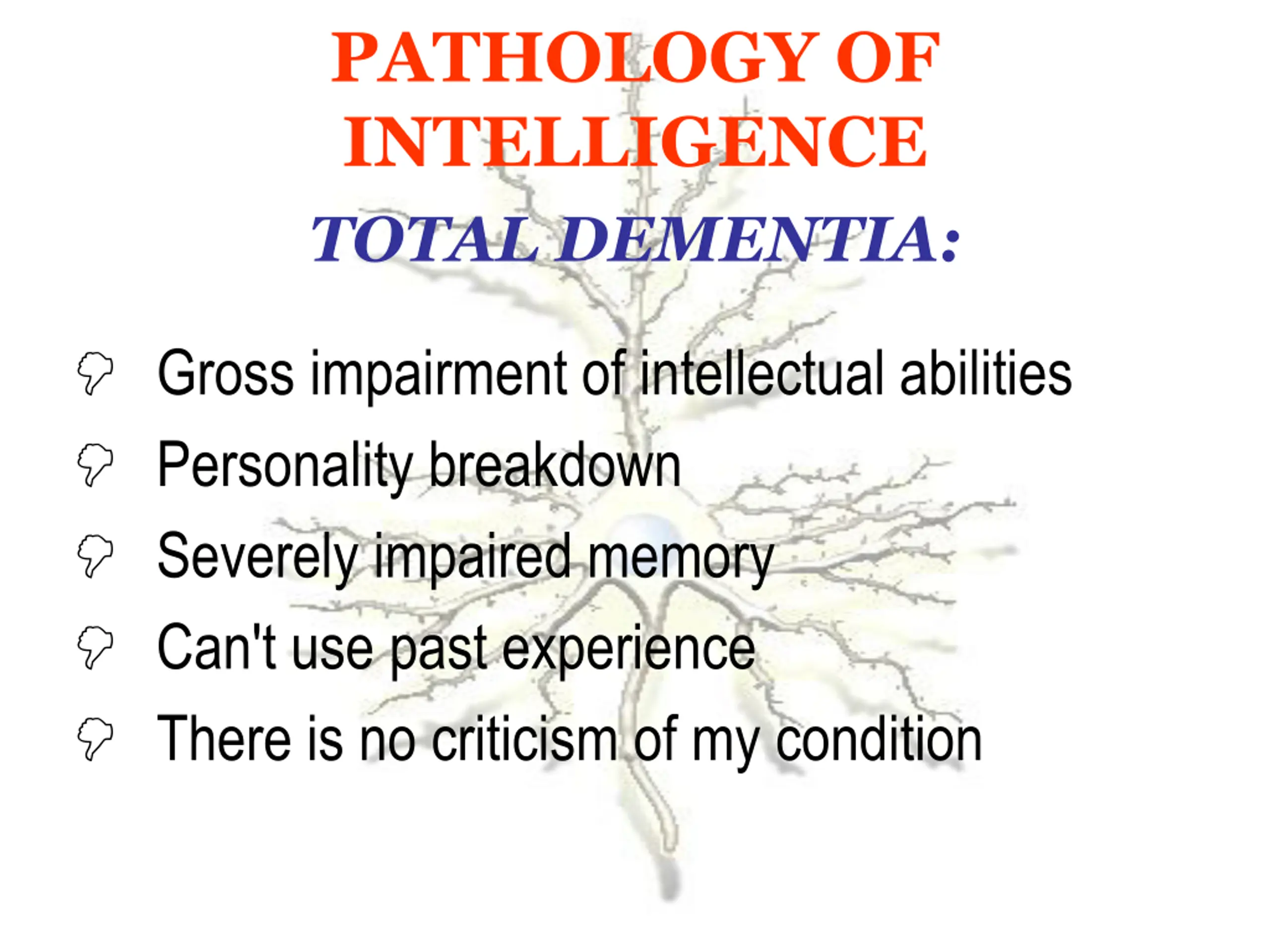PATHOLOGY OF INTELLIGENCE TOTAL DEMENTIA: Gross impairment of intellectual abilities Personality breakdown Severely impaired memory Can't use past experience There is no criticism of my condition