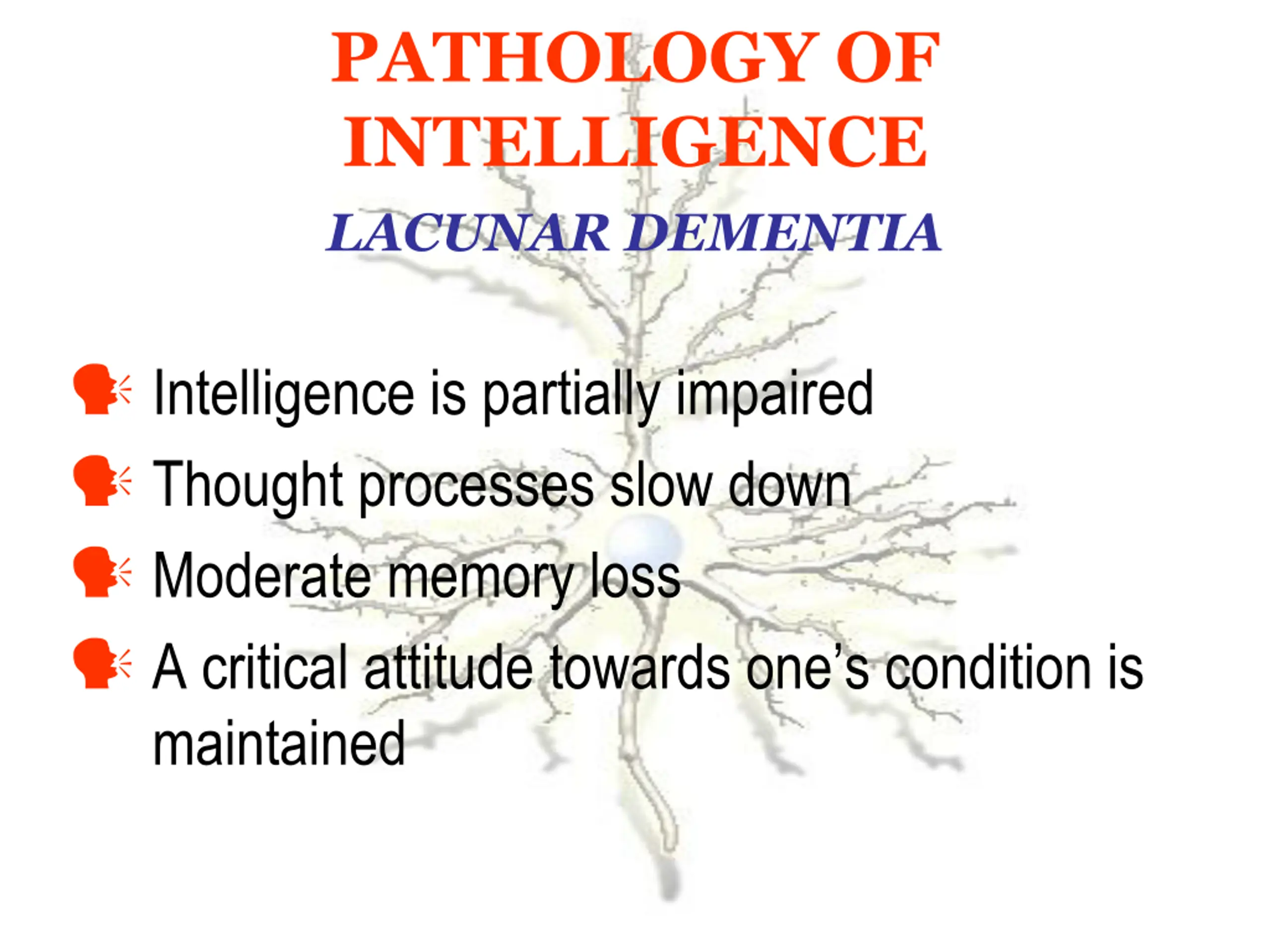 PATHOLOGY OF INTELLIGENCE LACUNAR DEMENTIA Intelligence is partially impaired Thought processes slow down Moderate memory loss A critical attitude towards one s condition is maintained