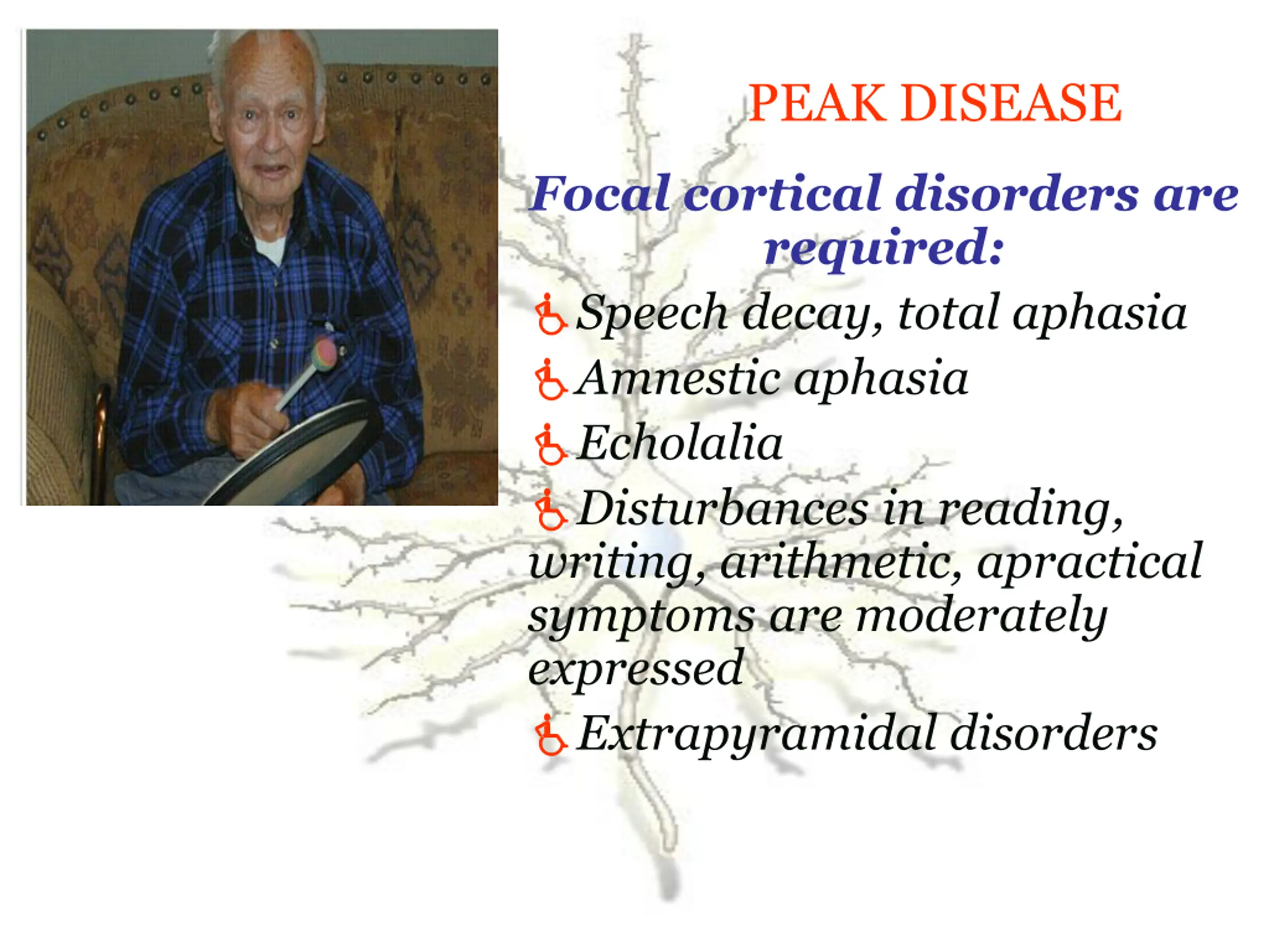 PEAK DISEASE Focal cortical disorders are required: Speech decay, total aphasia Amnestic aphasia Echolalia Disturbances in reading, writing, arithmetic, apractical symptoms are moderately expressed Extrapyramidal disorders