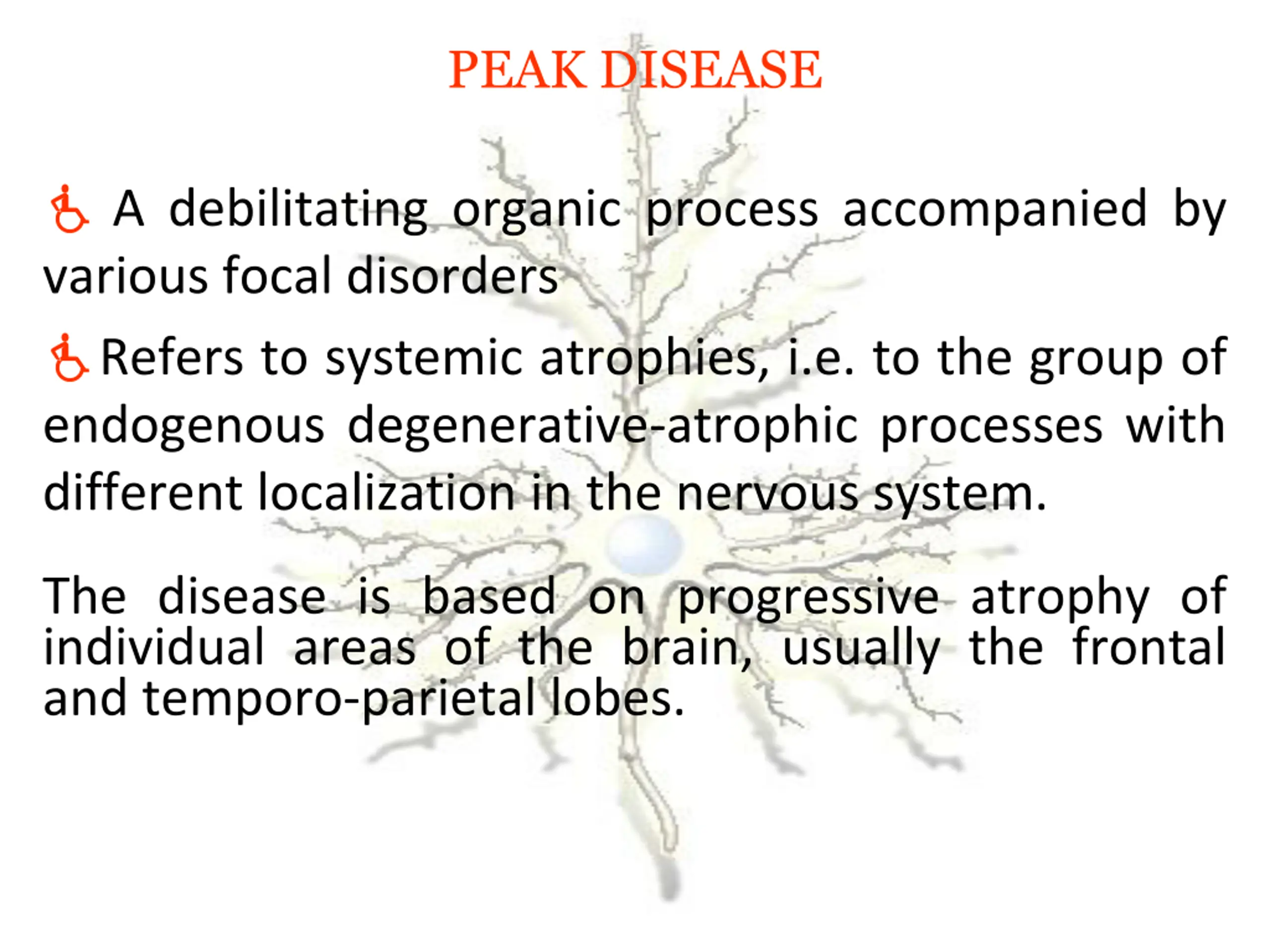 PEAK DISEASE A debilitating organic process accompanied by various focal disorders Refers to systemic atrophies, i.e. to the group of endogenous degenerative-atrophic processes with different localization in the nervous system. The disease is based on progressive atrophy of individual areas of the brain, usually the frontal and temporo-parietal lobes.
