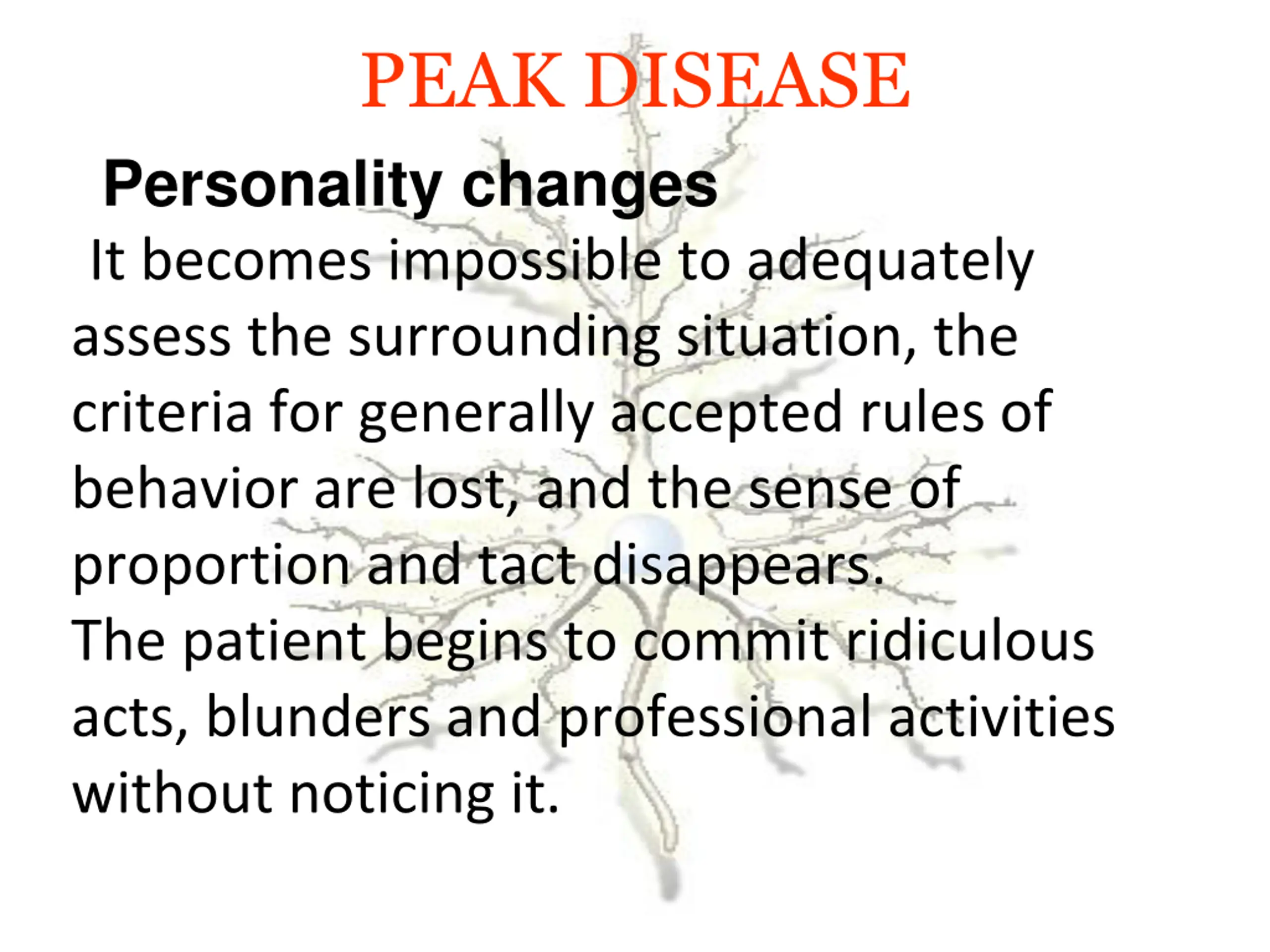 PEAK DISEASE Personality changes It becomes impossible to adequately assess the surrounding situation, the criteria for generally accepted rules of behavior are lost, and the sense of proportion and tact disappears. The patient begins to commit ridiculous acts, blunders and professional activities without noticing it.
