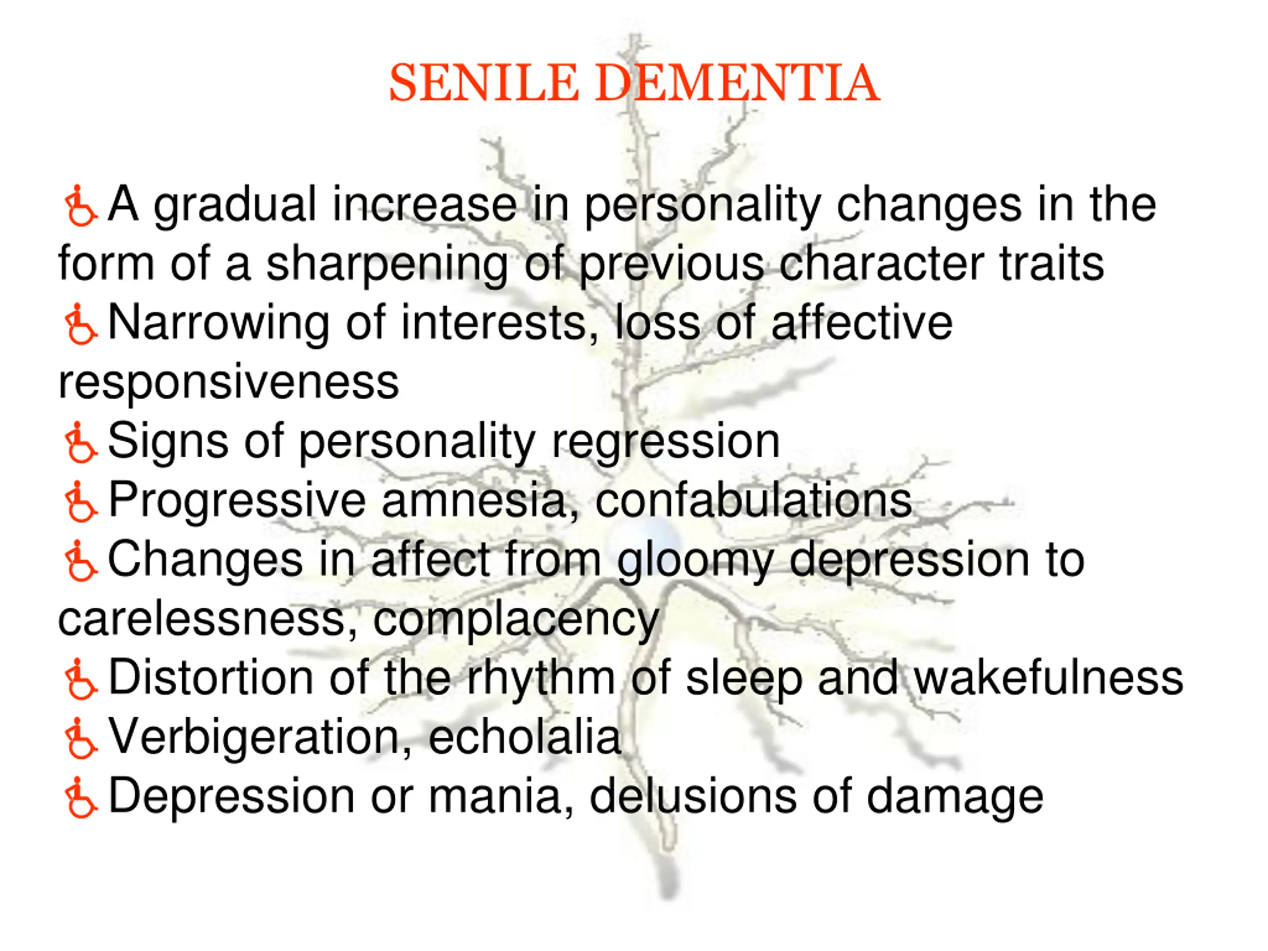 SENILE DEMENTIA A gradual increase in personality changes in the form of a sharpening of previous character traits Narrowing of interests, loss of affective responsiveness Signs of personality regression Progressive amnesia, confabulations Changes in affect from gloomy depression to carelessness, complacency Distortion of the rhythm of sleep and wakefulness Verbigeration, echolalia Depression or mania, delusions of damage