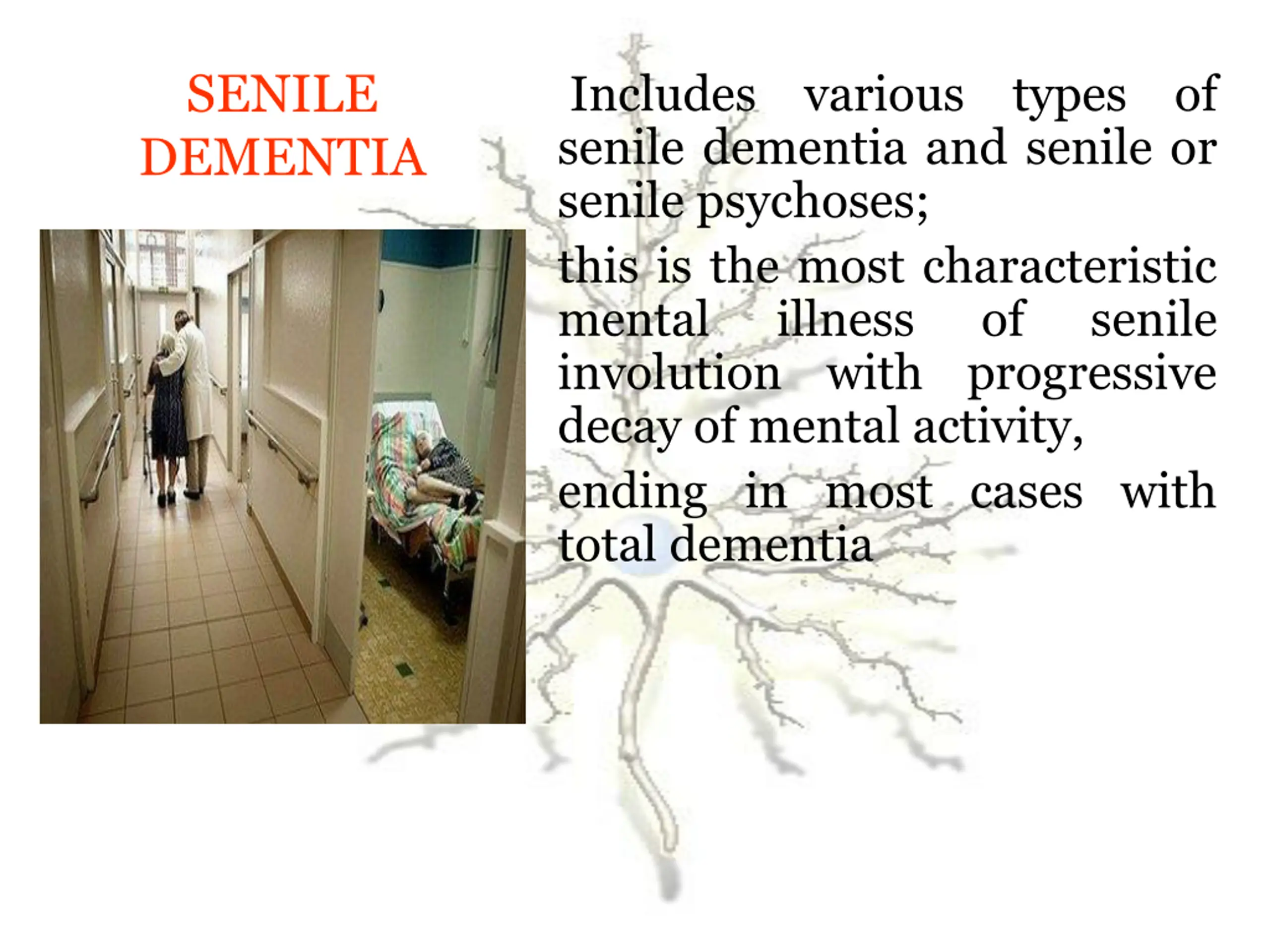 SENILE DEMENTIA Includes various types of senile dementia and senile or senile psychoses; this is the most characteristic mental illness involution with progressive decay of mental activity, ending in most cases with total dementia of senile