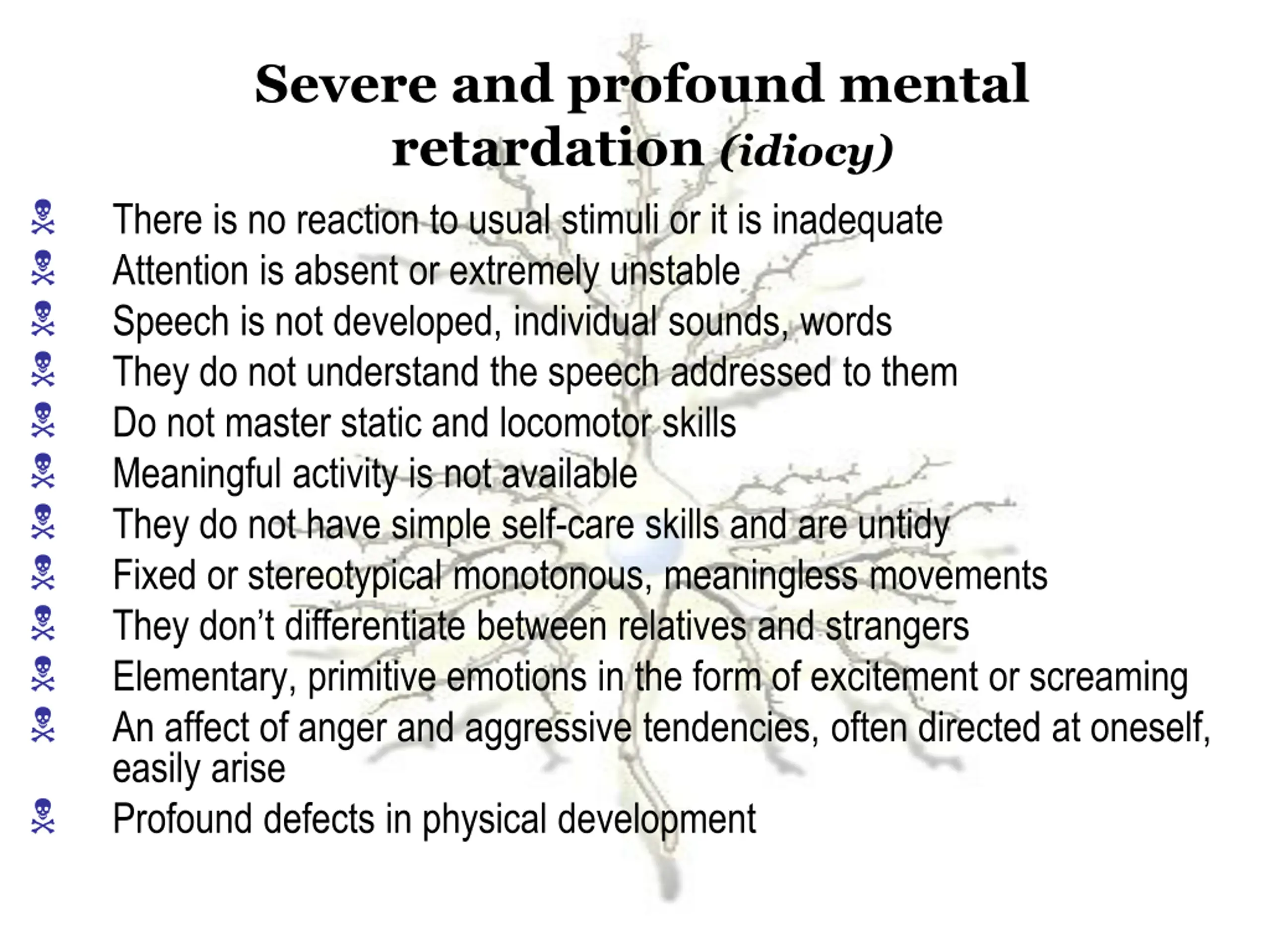 Severe and profound mental retardation (idiocy) There is no reaction to usual stimuli or it is inadequate Attention is absent or extremely unstable Speech is not developed, individual sounds, words They do not understand the speech addressed to them Do not master static and locomotor skills Meaningful activity is not available They do not have simple self-care skills and are untidy Fixed or stereotypical monotonous, meaningless movements They don t differentiate between relatives and strangers Elementary, primitive emotions in the form of excitement or screaming An affect of anger and aggressive tendencies, often directed at oneself, easily arise Profound defects in physical development