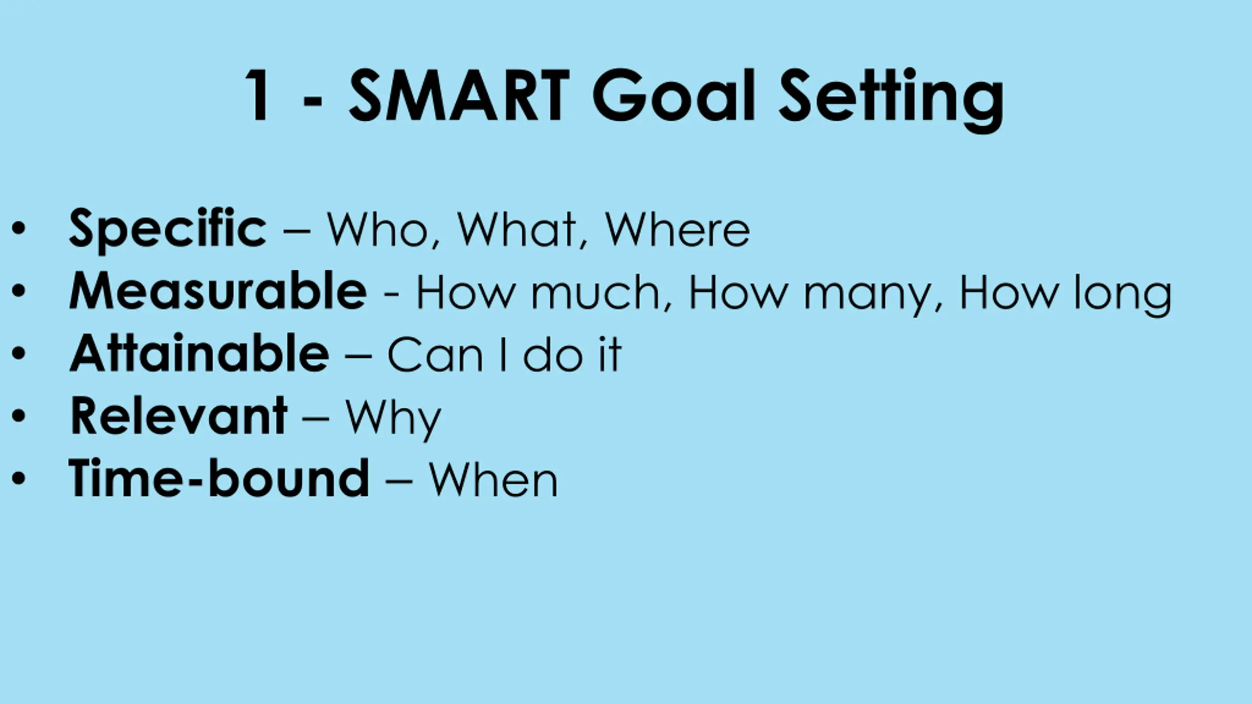 1 - SMART Goal Setting Specific Who, What, Where Measurable - How much, How many, How long Attainable Can I do it Relevant Why Time-bound When