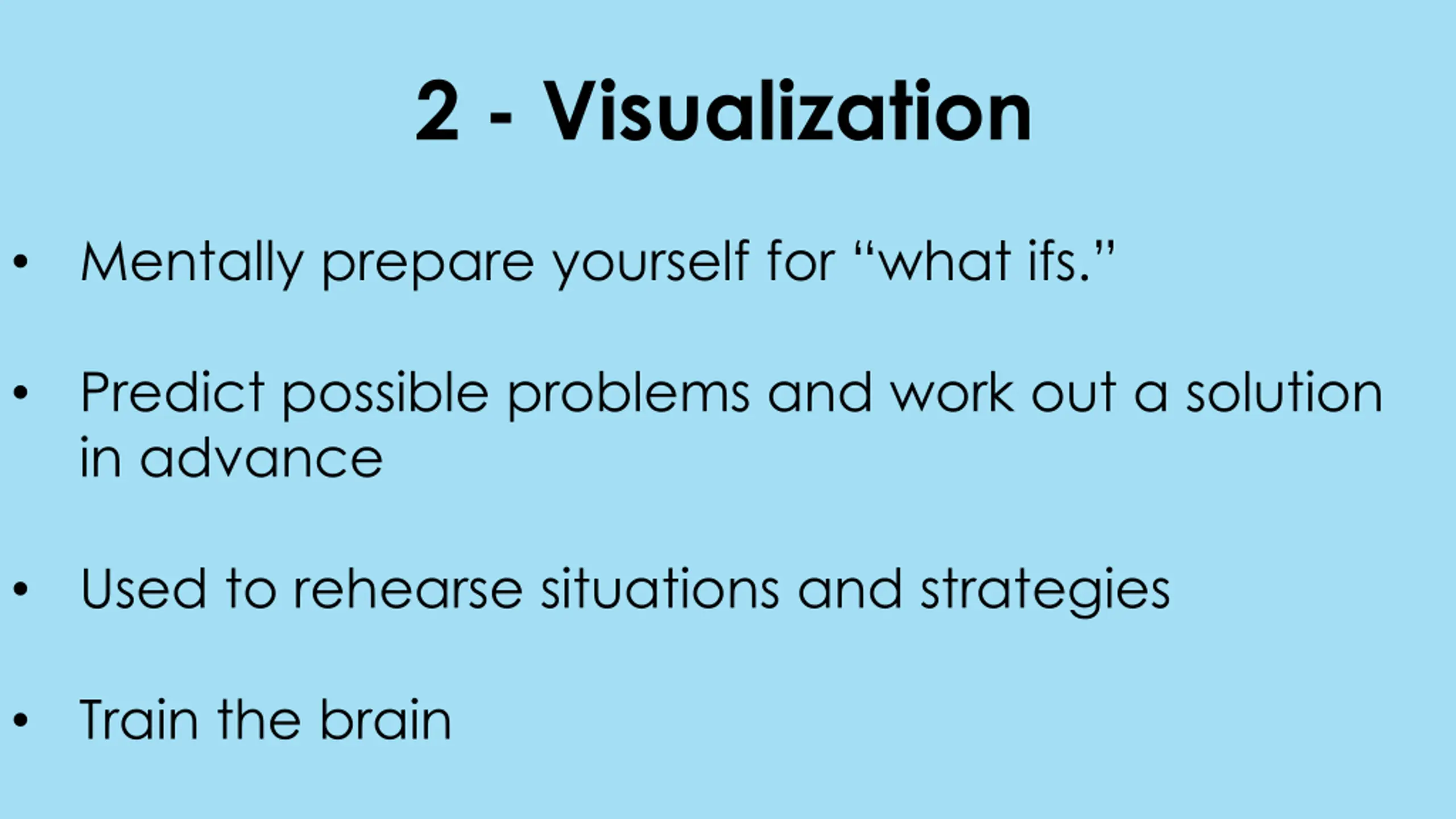 2 - Visualization Mentally prepare yourself for what ifs. Predict possible problems and work out a solution in advance Used to rehearse situations and strategies Train the brain
