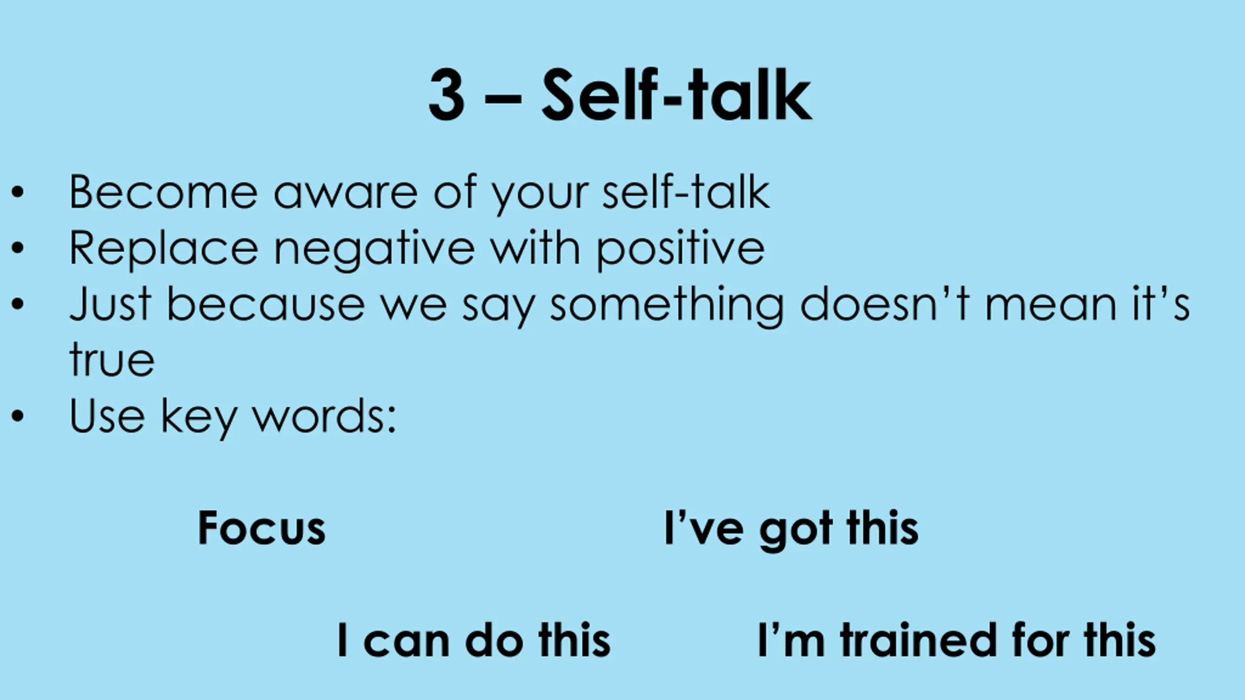 3 Self-talk Become aware of your self-talk Replace negative with positive Just because we say something doesn t mean it s true Use key words: FocusI ve got this I can do this I m trained for this
