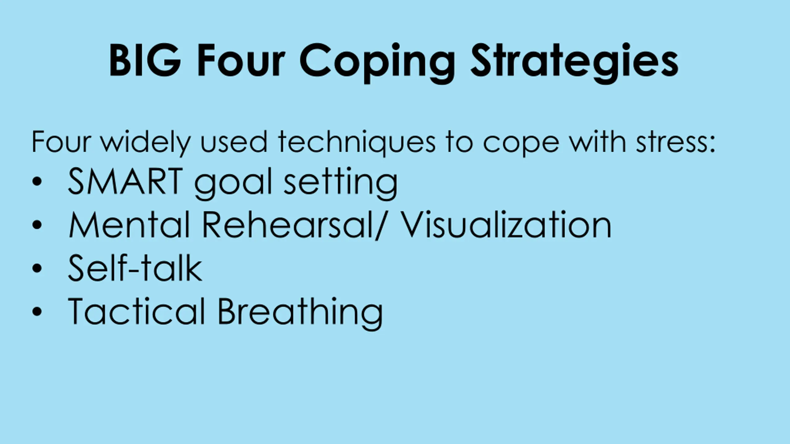 BIG Four Coping Strategies Four widely used techniques to cope with stress: SMART goal setting Mental Rehearsal/ Visualization Self-talk Tactical Breathing