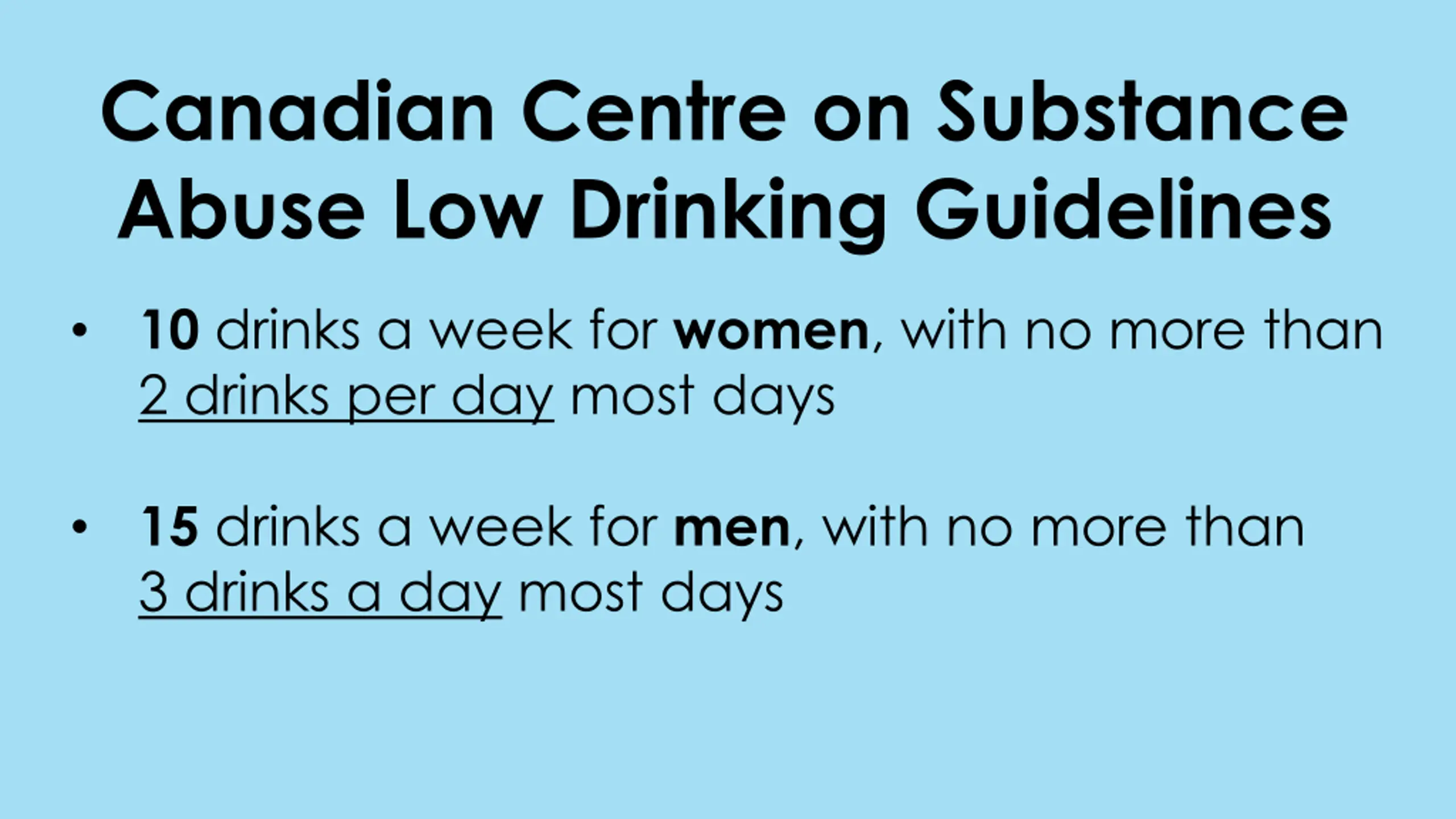 Canadian Centre on Substance Abuse Low Drinking Guidelines 10 drinks a week for women, with no more than 2 drinks per day most days 15 drinks a week for men, with no more than 3 drinks a day most days
