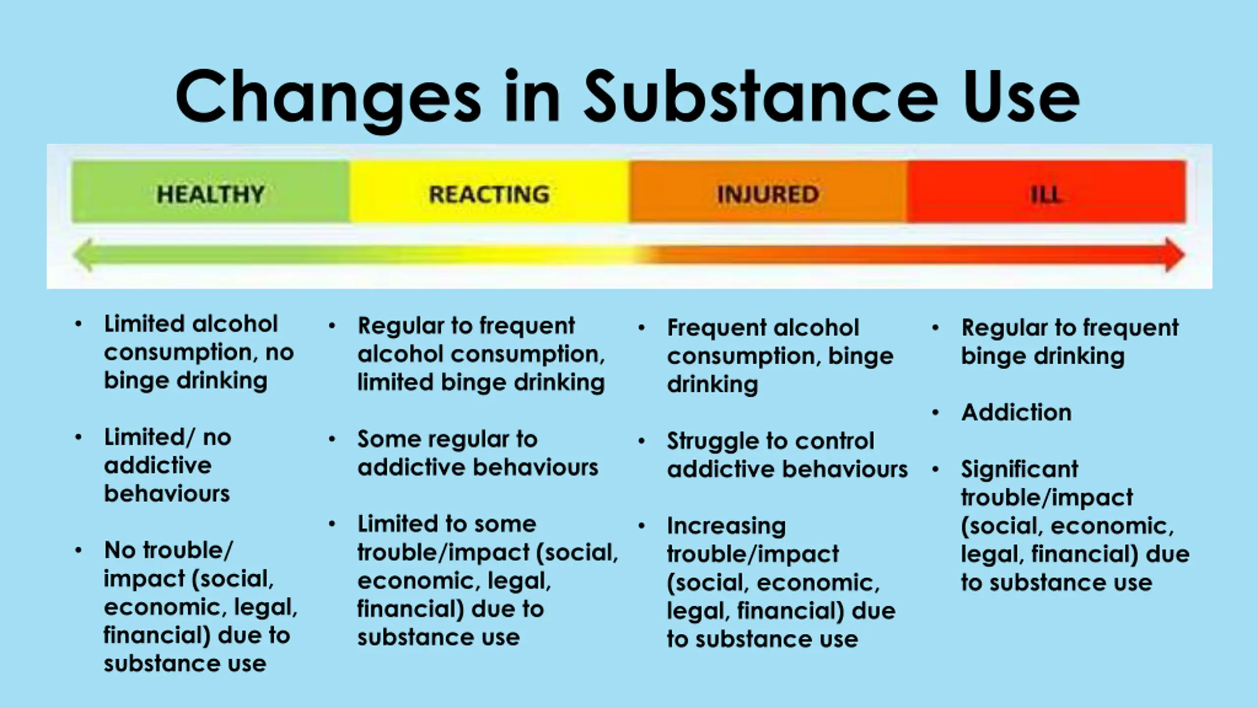 Changes in Substance Use Limited alcohol consumption, no binge drinking Regular to frequent alcohol consumption, limited binge drinking Frequent alcohol consumption, binge drinking Regular to frequent binge drinking Addiction Limited/ no addictive behaviours Some regular to addictive behaviours Struggle to control addictive behaviours Significant trouble/impact (social, economic, legal, financial) due to substance use Limited to some trouble/impact (social, economic, legal, financial) due to substance use Increasing trouble/impact (social, economic, legal, financial) due to substance use No trouble/ impact (social, economic, legal, financial) due to substance use