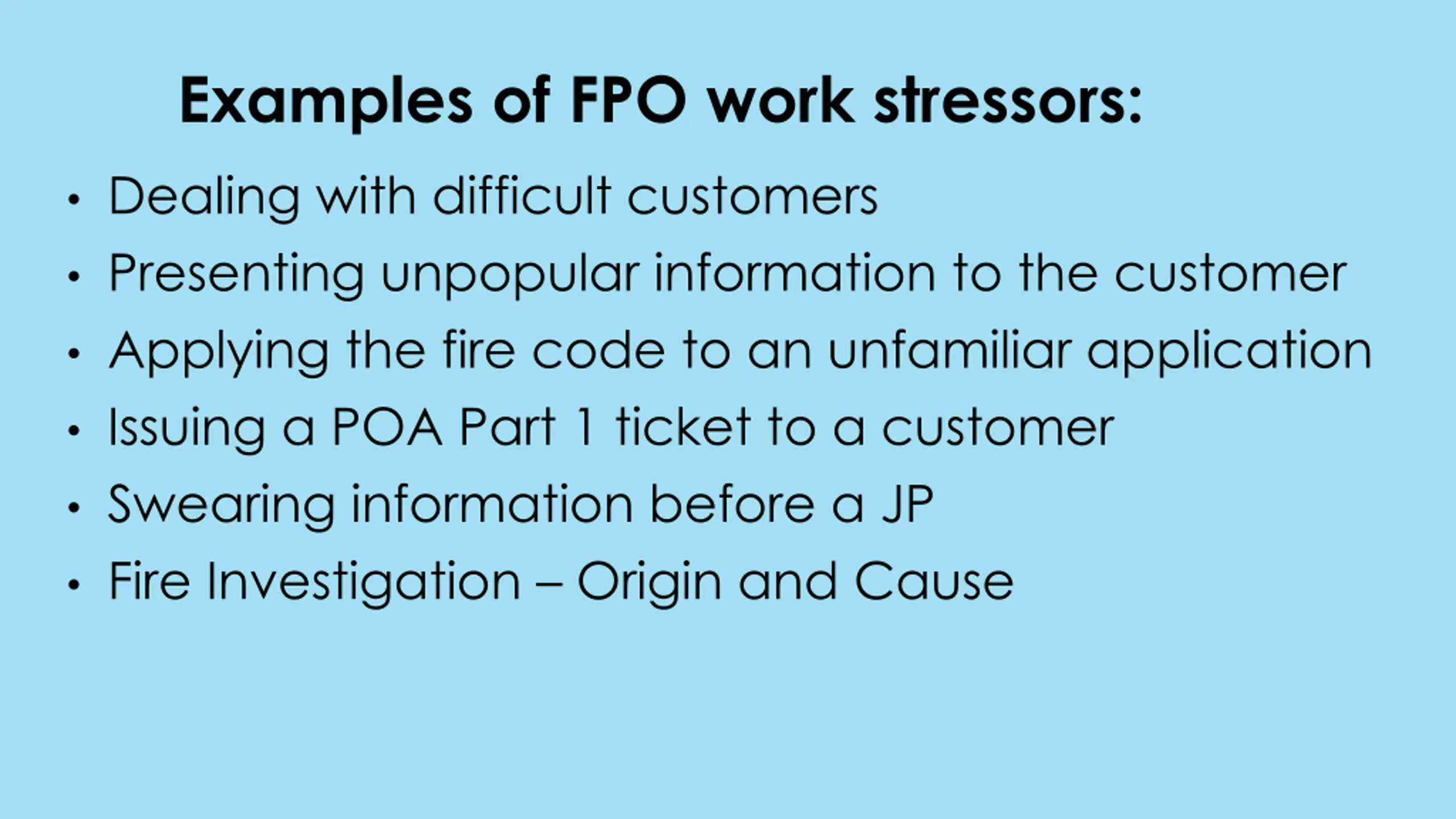 Examples of FPO work stressors: Dealing with difficult customers Presenting unpopular information to the customer Applying the fire code to an unfamiliar application Issuing a POA Part 1 ticket to a customer Swearing information before a JP Fire Investigation Origin and Cause
