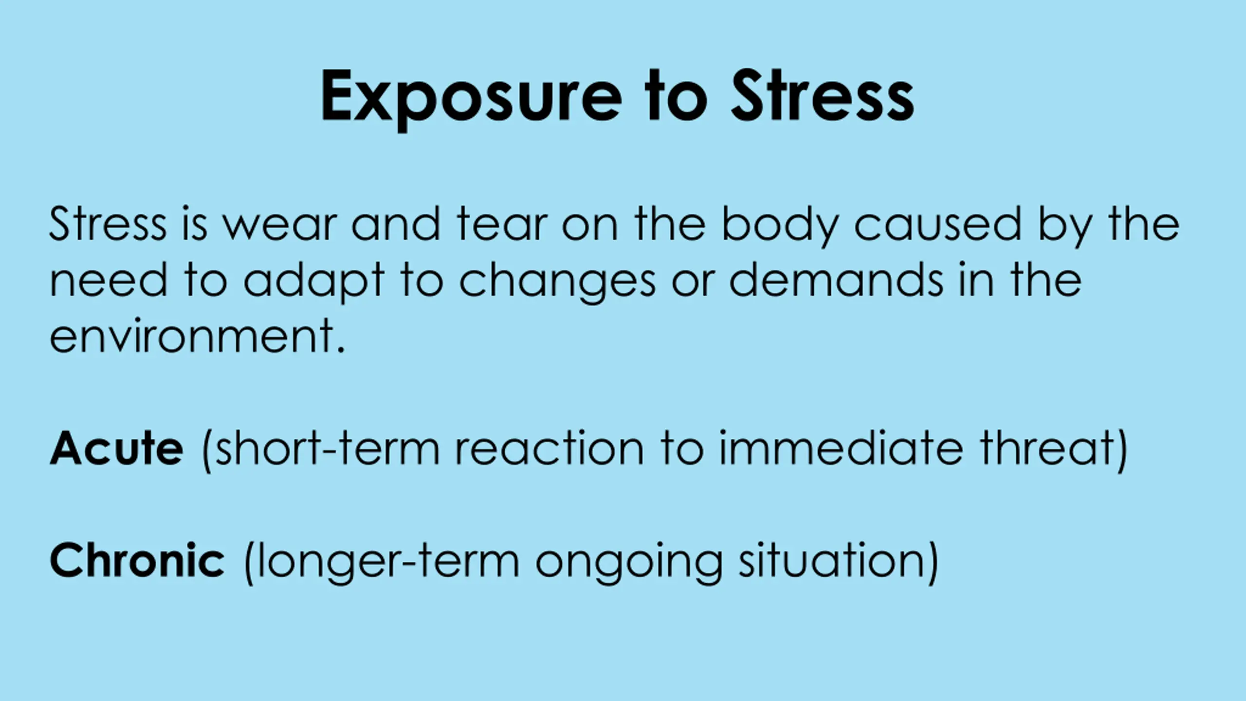 Exposure to Stress Stress is wear and tear on the body caused by the need to adapt to changes or demands in the environment. Acute (short-term reaction to immediate threat) Chronic (longer-term ongoing situation)