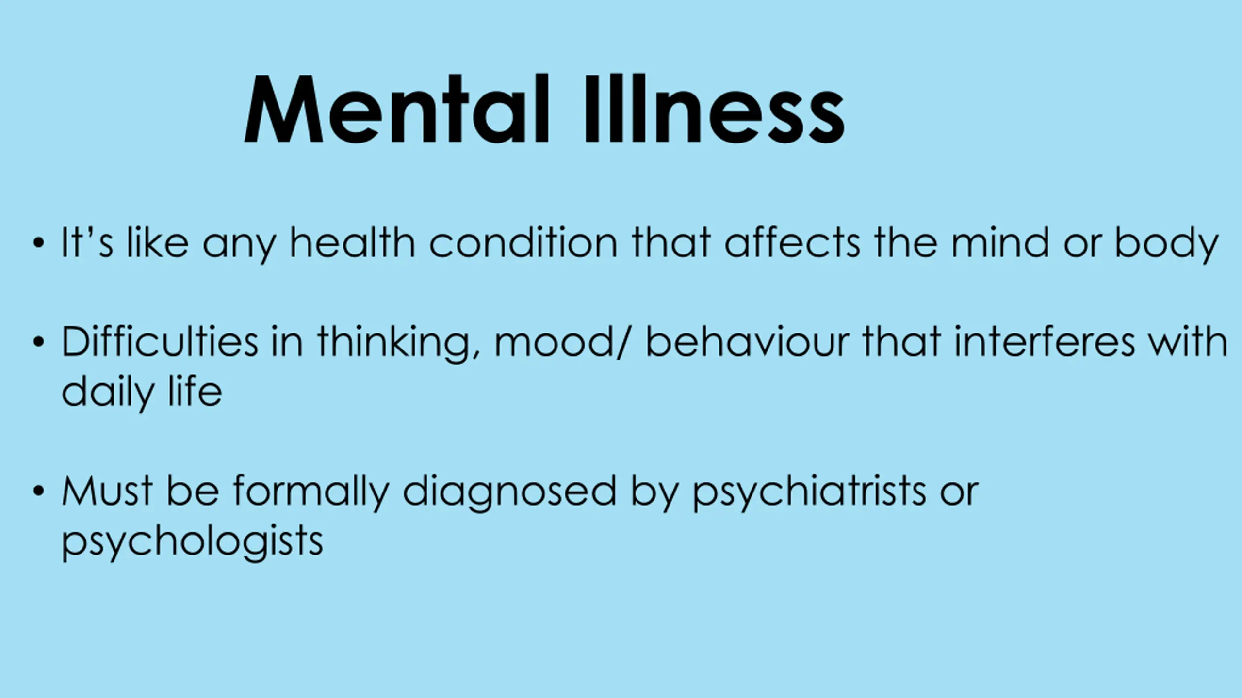 Mental Illness It s like any health condition that affects the mind or body Difficulties in thinking, mood/ behaviour that interferes with daily life Must be formally diagnosed by psychiatrists or psychologists