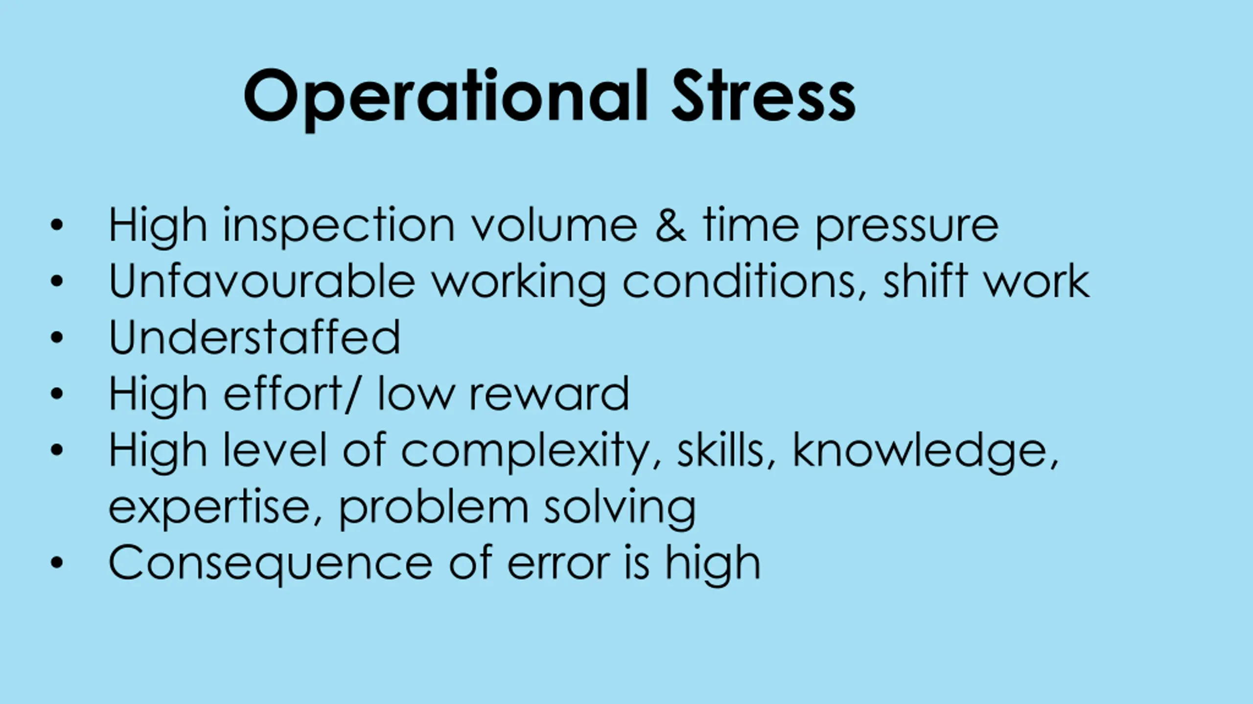 Operational Stress High inspection volume & time pressure Unfavourable working conditions, shift work Understaffed High effort/ low reward High level of complexity, skills, knowledge, expertise, problem solving Consequence of error is high