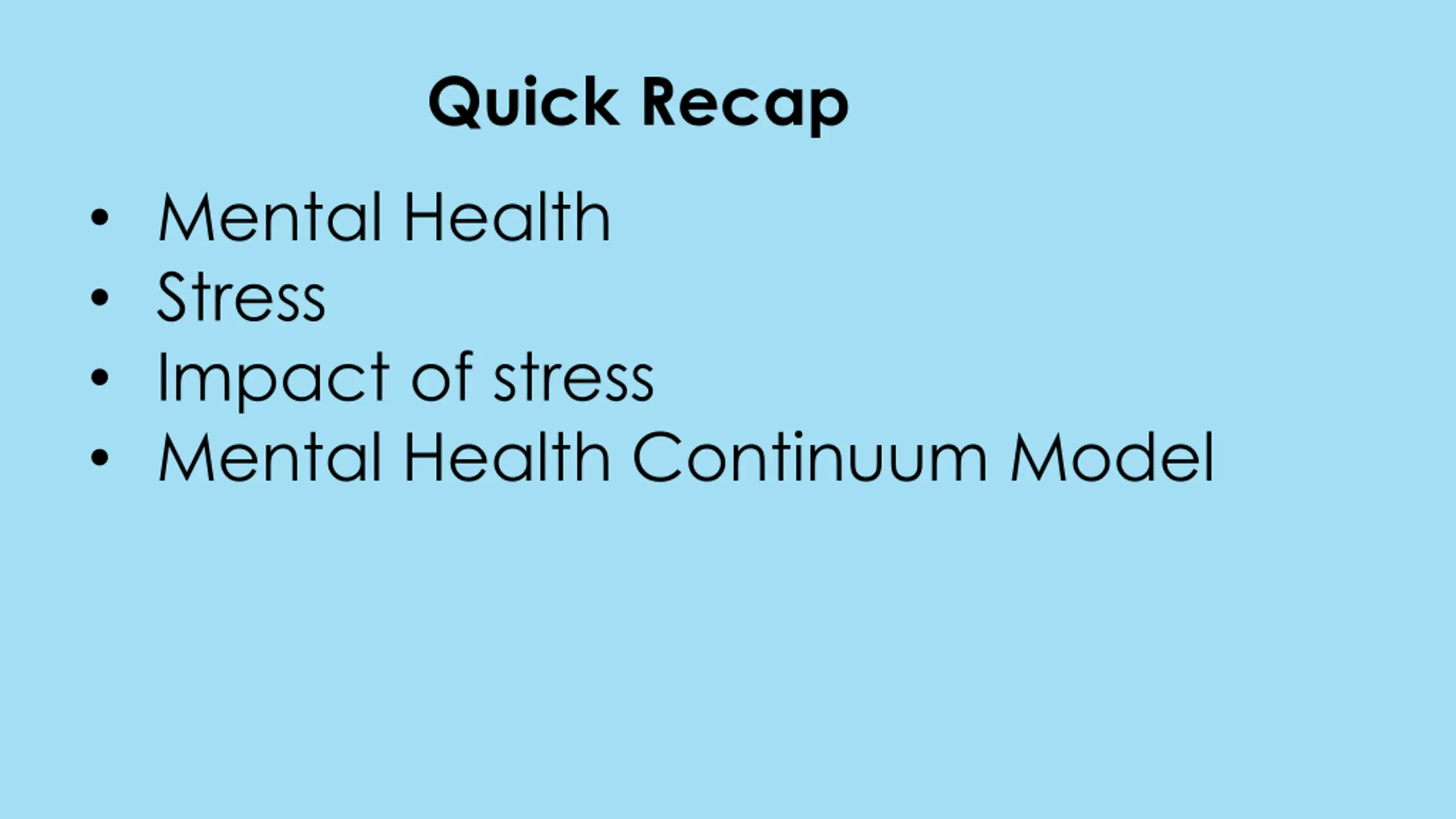 Quick Recap Mental Health Stress Impact of stress Mental Health Continuum Model