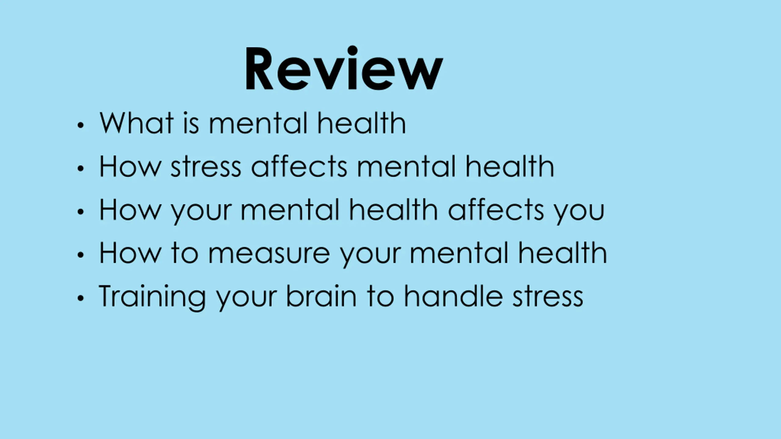 Review What is mental health How stress affects mental health How your mental health affects you How to measure your mental health Training your brain to handle stress