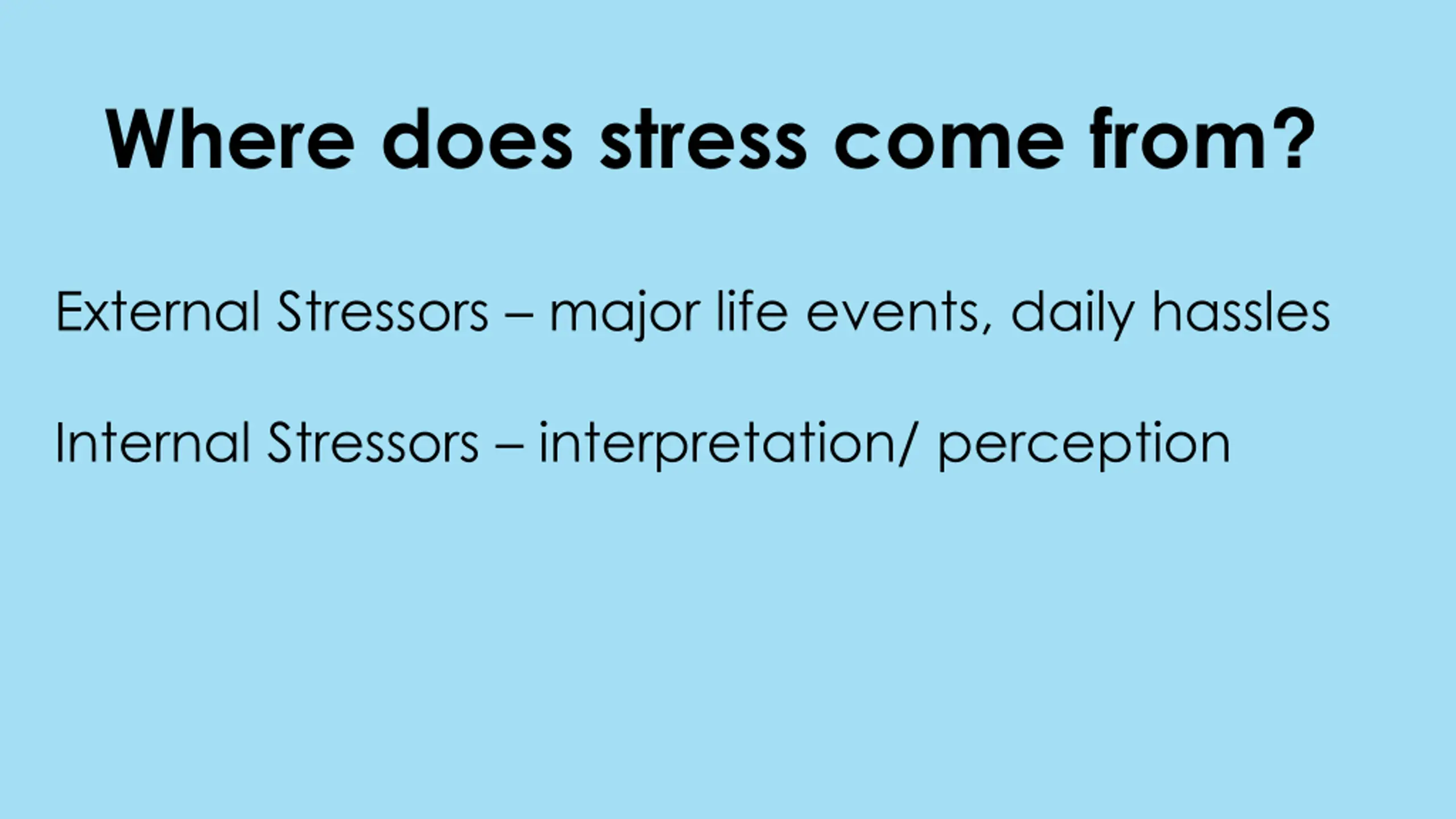 Where does stress come from? External Stressors major life events, daily hassles Internal Stressors interpretation/ perception