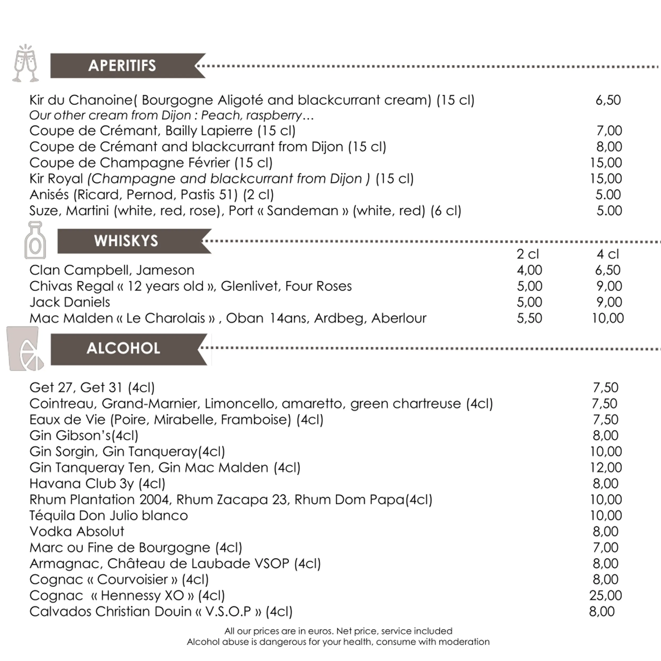 APERITIFS Kir du Chanoine( Bourgogne Aligot and blackcurrant cream) (15 cl) Our other cream from Dijon : Peach, raspberry Coupe de Cr mant, Bailly Lapierre (15 cl) Coupe de Cr mant and blackcurrant from Dijon (15 cl) Coupe de Champagne F vrier (15 cl) Kir Royal (Champagne and blackcurrant from Dijon ) (15 cl) Anis s (Ricard, Pernod, Pastis 51) (2 cl) Suze, Martini (white, red, rose), Port Sandeman (white, red) (6 cl) 6,50 7,00 8,00 15,00 15,00 5.00 5.00 WHISKYS 2 cl 4,00 6,50 4 cl Clan Campbell, Jameson Chivas Regal 12 years old , Glenlivet, Four Roses 5,00 Jack Daniels Mac Malden Le Charolais , Oban 14ans, Ardbeg, Aberlour 9,00 9,00 5,00 5,50 10,00 ALCOHOL Get 27, Get 31 (4cl) Cointreau, Grand-Marnier, Limoncello, amaretto, green chartreuse (4cl) Eaux de Vie (Poire, Mirabelle, Framboise) (4cl) Gin Gibson s(4cl) Gin Sorgin, Gin Tanqueray(4cl) Gin Tanqueray Ten, Gin Mac Malden (4cl) Havana Club 3y (4cl) Rhum Plantation 2004, Rhum Zacapa 23, Rhum Dom Papa(4cl) T quila Don Julio blanco Vodka Absolut Marc ou Fine de Bourgogne (4cl) Armagnac, Ch teau de Laubade VSOP (4cl) Cognac Courvoisier (4cl) Cognac Hennessy XO (4cl) Calvados Christian Douin V.S.O.P (4cl) 7,50 7,50 7,50 8,00 10,00 12,00 8,00 10,00 10,00 8,00 7,00 8,00 8,00 25,00 8,00 All our prices are in euros. Net price, service included Alcohol abuse is dangerous for your health, consume with moderation