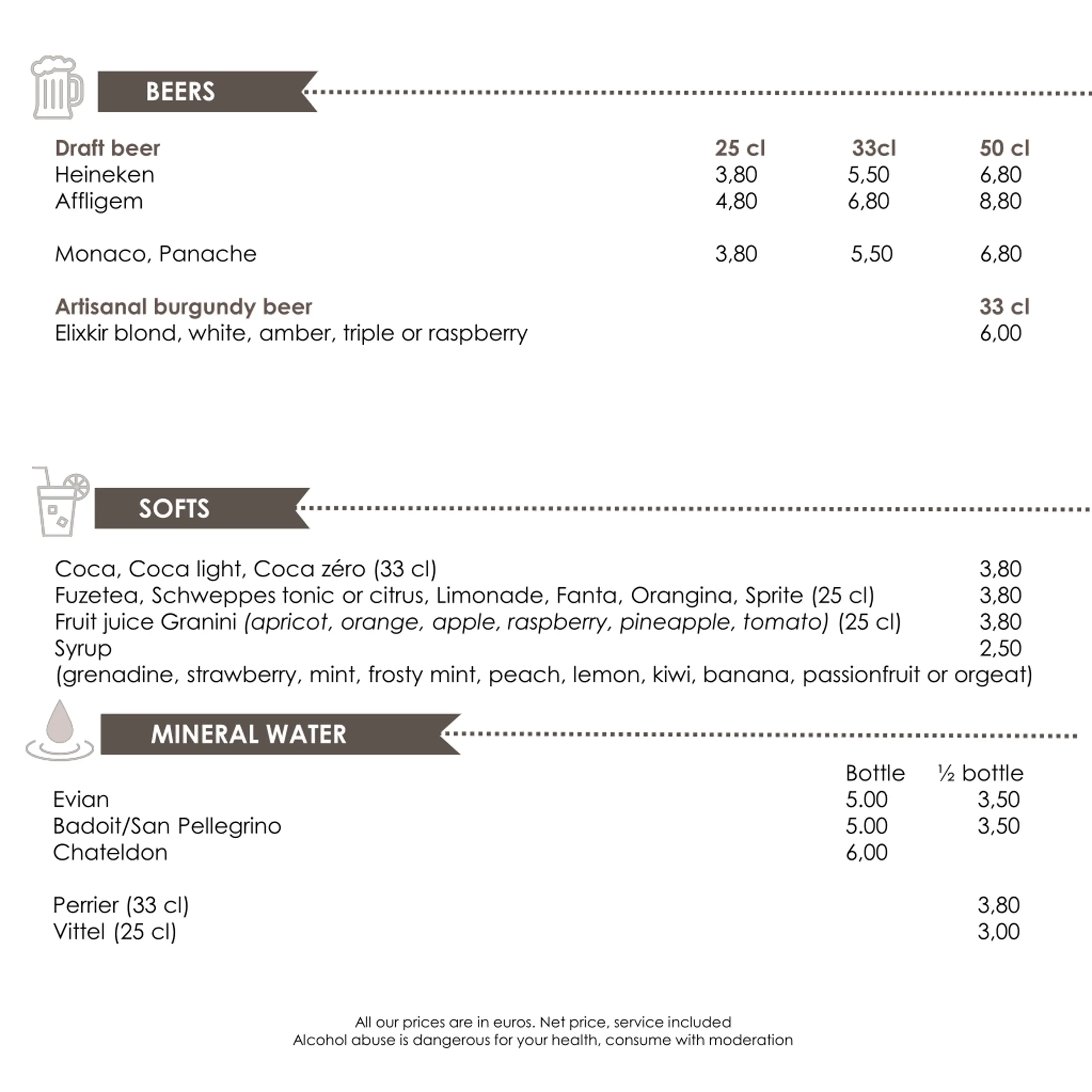 BEERS Draft beer Heineken Affligem 25 cl 33cl 3,80 4,80 50 cl 6,80 8,80 5,50 6,80 Monaco, Panache 3,80 5,50 6,80 Artisanal burgundy beer Elixkir blond, white, amber, triple or raspberry 33 cl 6,00 SOFTS Coca, Coca light, Coca z ro (33 cl) Fuzetea, Schweppes tonic or citrus, Limonade, Fanta, Orangina, Sprite (25 cl) Fruit juice Granini (apricot, orange, apple, raspberry, pineapple, tomato) (25 cl) Syrup (grenadine, strawberry, mint, frosty mint, peach, lemon, kiwi, banana, passionfruit or orgeat) 3,80 3,80 3,80 2,50 MINERAL WATER Bottle bottle 5.00 5.00 6,00 Evian Badoit/San Pellegrino Chateldon 3,50 3,50 Perrier (33 cl) Vittel (25 cl) 3,80 3,00 All our prices are in euros. Net price, service included Alcohol abuse is dangerous for your health, consume with moderation