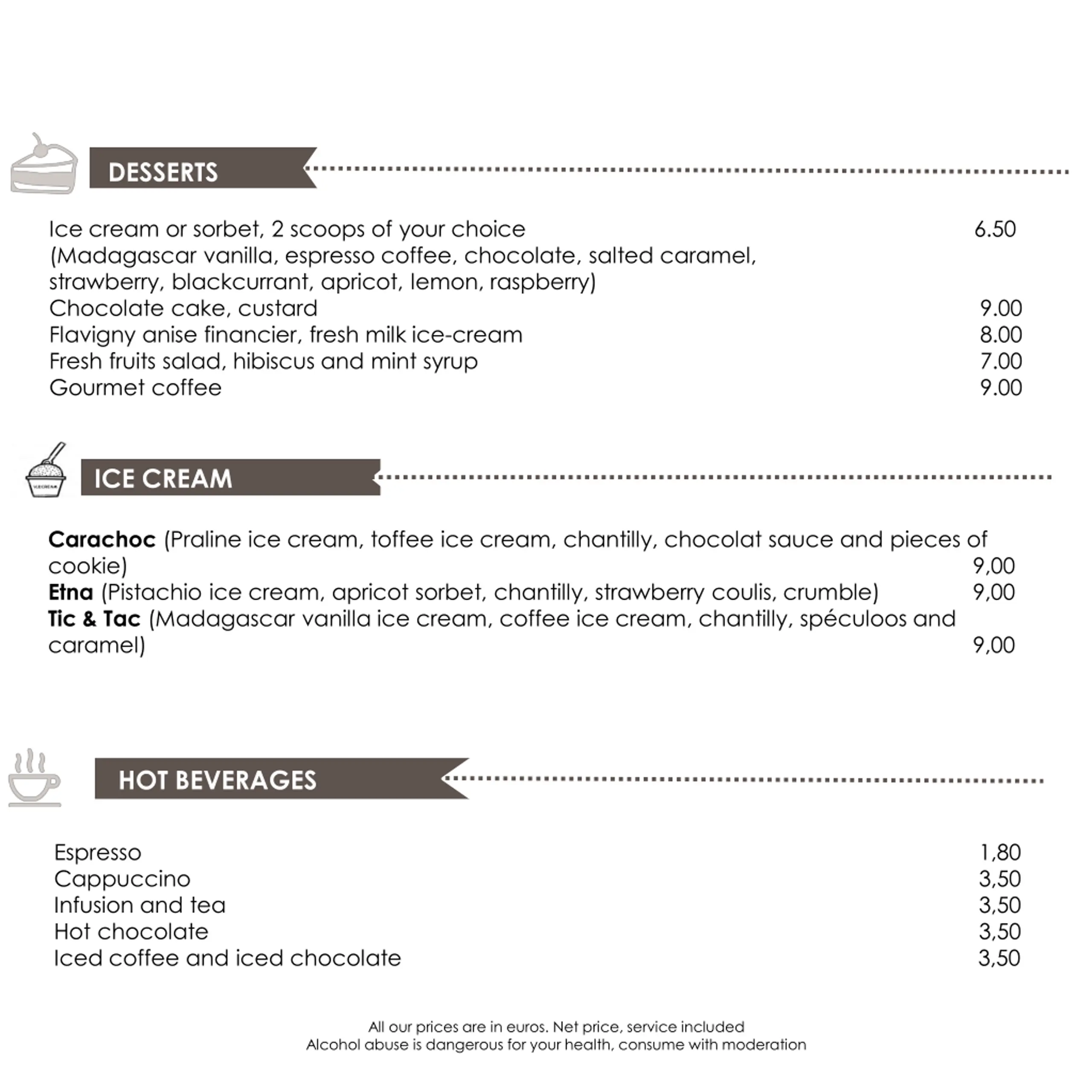 DESSERTS Ice cream or sorbet, 2 scoops of your choice (Madagascar vanilla, espresso coffee, chocolate, salted caramel, strawberry, blackcurrant, apricot, lemon, raspberry) Chocolate cake, custard Flavigny anise financier, fresh milk ice-cream Fresh fruits salad, hibiscus and mint syrup Gourmet coffee 6.50 9.00 8.00 7.00 9.00 ICE CREAM Carachoc (Praline ice cream, toffee ice cream, chantilly, chocolat sauce and pieces of cookie) Etna (Pistachio ice cream, apricot sorbet, chantilly, strawberry coulis, crumble) Tic & Tac (Madagascar vanilla ice cream, coffee ice cream, chantilly, sp culoos and caramel) 9,00 9,00 9,00 HOT BEVERAGES Espresso Cappuccino Infusion and tea Hot chocolate Iced coffee and iced chocolate 1,80 3,50 3,50 3,50 3,50 All our prices are in euros. Net price, service included Alcohol abuse is dangerous for your health, consume with moderation